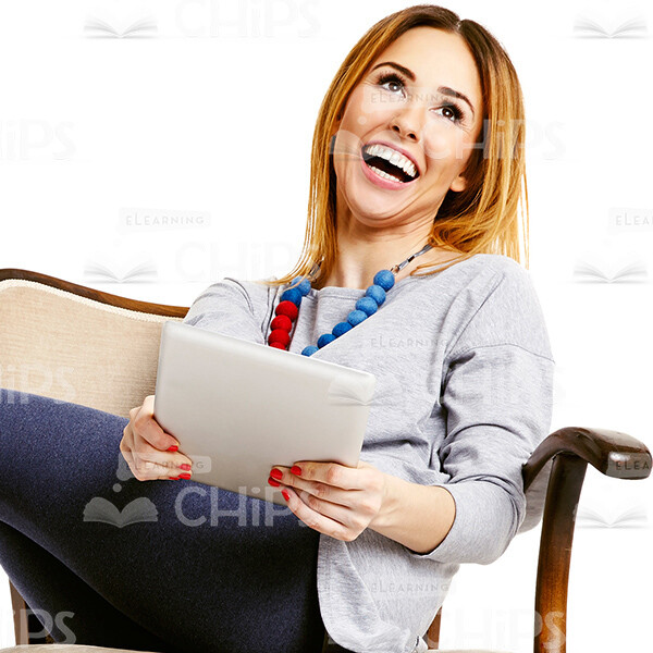 High-quality cutout image of the young woman sitting half-turned on a lounge chair. She is looking up. She laughs with relief. Her mouth is widely open. She looks happy. She has good news. She knows that all will be good. She holds the tablet with both hands in front of her. Her legs are thrown over the arm of the chair. Both legs are bent at the knees. The woman has dark eyes and her long ombre colored hair gradually blends from brown to blond. She is dressed in the blue jeans with the grey pullover, red in white speck high-heeled shoes.