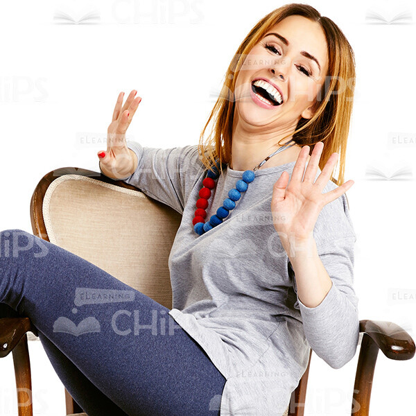 Cutout Image Of Sitting On A Lounge Chair Laughing Woman Throwing Hands Up