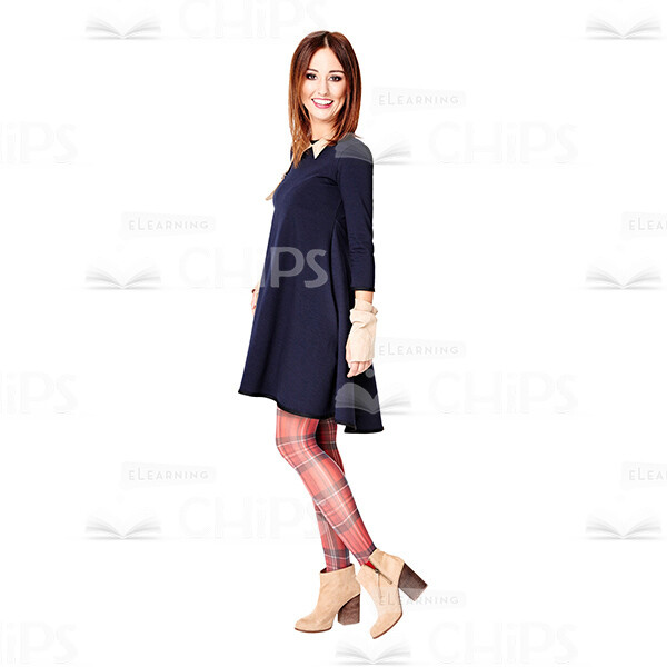High-quality cutout image of a nice young woman standing half turned. She is wearing a short dark blue dress, which looks like a school dress. Beige mitts and bulky shoes make her attire very stylish and special. Coloured tights contrast with the plain casual dress. Nice woman is looking at the camera and is smiling. . The cut out photo would be a perfect addition to any kind of web and print related project. It is available in few different sizes such as M, L and XL. Transparent background greatly facilitates the process of working with the picture. Just choose the size you need and start to create your own visual story.