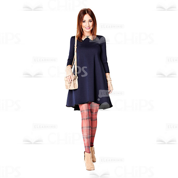 Full-resolution cutout image of an attractive young woman standing in full-growth while looking at the camera. She is like making a step forward. She is smiling sweetly and seems to be very satisfied with her life. Nice lady is wearing short dark blue dress, beige mitts and shoes. The bag of the same colour is slunging across her shoulder. Coloured tights complete the charming image. The cutout image is available in few different formats such as M, L, and in the full-resolution – XL. It can be used to illustrate a handsome character in any kind of web and print related projects. Transparent background greatly facilitates the process of working with the picture. Just choose the size you need and start to create your own visual story.