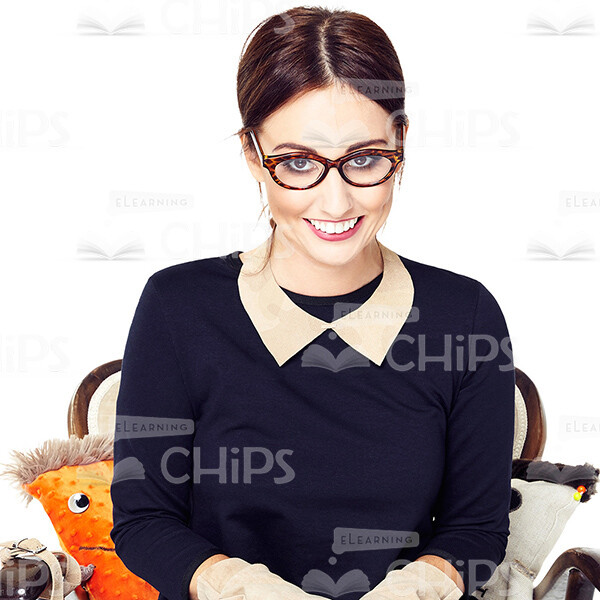 Full-resolution cutout image of an elegant young woman sitting in the armchair. She put her one hand on the open book; in the other hand she is holding her glasses. Charming young woman is looking at the camera, she is smiling. Nice woman is wearing dark blue dress, coloured tights, beige mitts and shoes. The cutout image is available in few different formats such as M, L, and in the full-resolution – XL. It can be used to illustrate a handsome character in any kind of web and print related projects. Transparent background greatly facilitates the process of working with the picture. Just choose the size you need and start to create your own visual story.