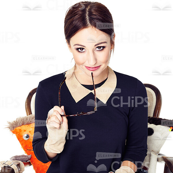 Full-resolution cutout image of an elegant young woman sitting in the armchair. She tore herself from a book and now is pondering over what she has recently read. She put the temple of the glasses in her mouth. The other hand is lying on the open book. Beautiful lady is looking at the camera. She is smiling slightly. Elegant woman is wearing dark blue dress, coloured tights, beige mitts and shoes. The cutout image is available in few different formats such as M, L, and in the full-resolution – XL. It can be used to illustrate a handsome character in any kind of web and print related projects. Transparent background greatly facilitates the process of working with the picture. Just choose the size you need and start to create your own visual story.
