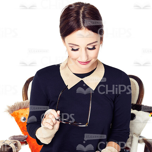 Full-resolution cutout image of an elegant young woman sitting in the armchair. She has been reading a book, but has taken off her glasses recently. She put the temple of the glasses in her mouth. Now she is looking at the camera. Beautiful lady is smiling. Her attire is very special, dark blue dress with beige collar is combined with shoes and mitts of the same colour. The cutout image is available in few different formats such as M, L, and in the full-resolution – XL. It can be used to illustrate a handsome character in any kind of web and print related projects. The presence of a transparent background greatly facilitates the process of working with the picture. Just choose the size you need and start to create your own visual story.