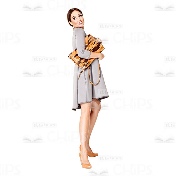 Full-resolution cutout image of an elegant young woman wearing a short grey dress is standing half-turned and looking back over her shoulder. She is smiling. Her legs are slightly bent. A big spotty ginger bag is under her arm. It is combined with ochre high heels. The girl’s hair is tied up. The cutout image is available in few different formats such as M, L, and in the full-resolution – XL. It can be used to illustrate a handsome character in any kind of web and print related projects. Transparent background greatly facilitates the process of working with the picture. Just choose the size you need and start to create your own visual story.