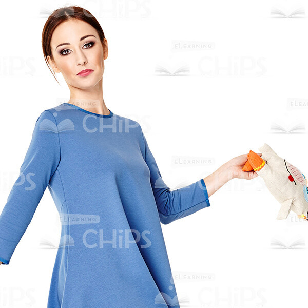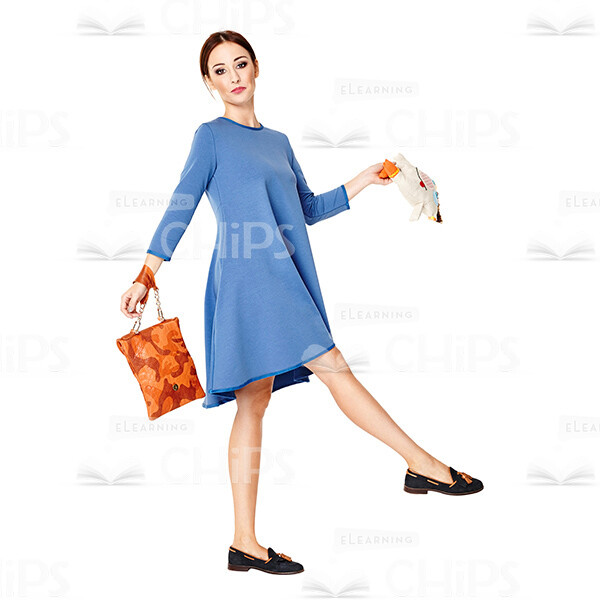 High-quality image of a nice young woman in a short blue dress is standing and about to make step ahead. The beautiful lady is looking at the camera. She is very serious and concentrated. Young lady wrapped the belt of the bag over her hand; in the other hand she is holding a fluffy toy. The dress is plain cut with the slim 3/4-length sleeves. Ginger bag combines with the brushes of the black shoes. The girl’s hair is tied up. The cutout image is available in few different formats such as M, L, and in the full-resolution – XL. The cut out photo would be a perfect addition to any kind of web and print related project. The availability of a transparent background allows you to save time and effort on the additional picture processing.