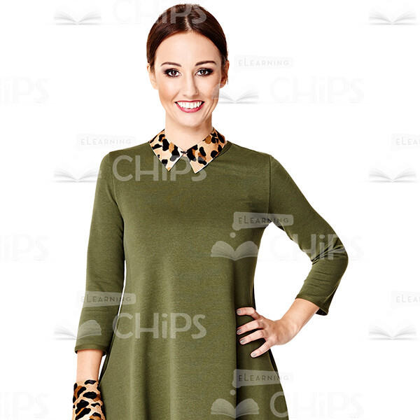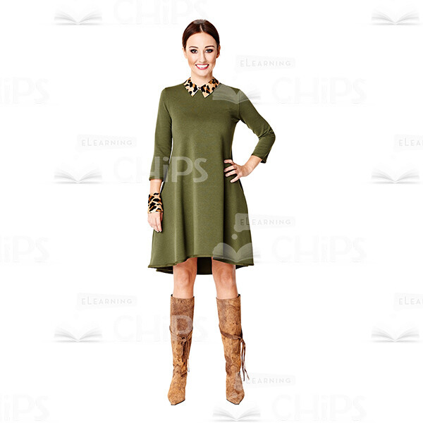 Full-resolution cutout image of a beautiful young lady is standing upright; her hand is lying on her hips. The girl is looking at the camera and smiling. She is positive and pleased with herself. The nice woman is wearing a short green dress, which is very plain cut and has slim 3/4-length sleeves. The dress is decorated with the collar of leopard colour. There is an extravagant bracelet of the same shade on her left hand. The elegant lady is wearing light brown high boots with the fringe. The cutout image is available in few different formats such as M, L, and in the full-resolution – XL. It can be used to illustrate a handsome character in any kind of web and print related projects. Transparent background greatly facilitates the process of working with the picture. Just choose the size you need and start to create your own visual story.