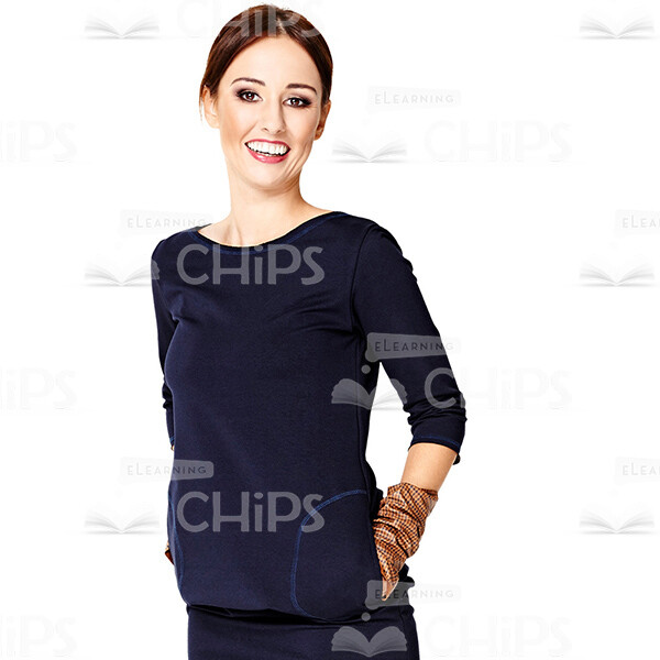 Cutout Character of a Smiling Young Woman in a Black Dress with Her Hands in the Pockets