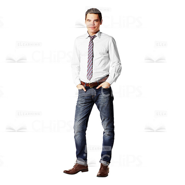 Full-length cutout image of the handsome friendly young boy. The boy is smiling and looking relaxed. His eyes are directed at the camera. He is holding both his hands in the pockets of his jeans. He is dressed in the blue jeans with the brown belt and in the white shirt. He has a checkered blue-red-white tie and brown leather shoes. Boy has dark eyes and dark brown hair. He can be student, trader or office employee.