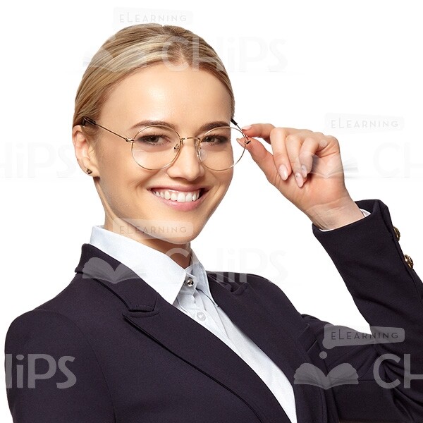 Cutout Image of Smiling Businesswoman Wearing Glasses. The character looks cheerful and friendly. Her eyes are directed at the camera. The photo might be suitable for illustration of a business woman, female narrator or mentor in any kind of web-design projects (eLearning courses, presentations, advertisements, etc.). It is available in several formats: M, L and XL, so you can look for some that suits you best. Our cheap cutout people photos allows to cover almost any learning situations. Feel free to choose any that you like and don’t forget to leave a review.