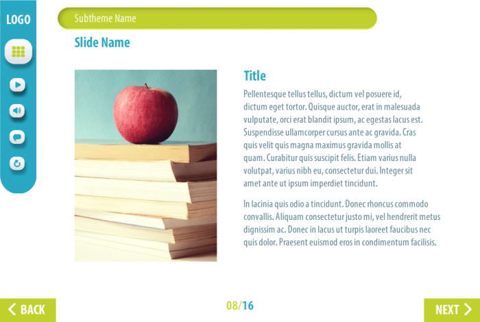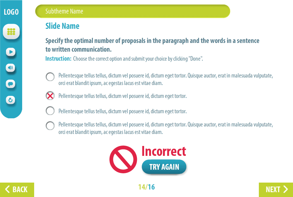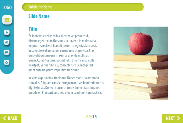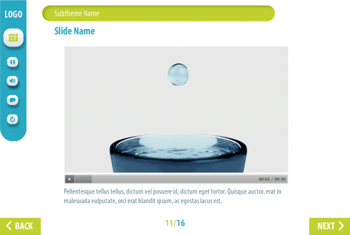 It has 16 sample slides that will be enough to develop your own e-learning course. The storyline template contains character, flip-chart image, three versions of image slides; it’s already designed and prepared for usage.