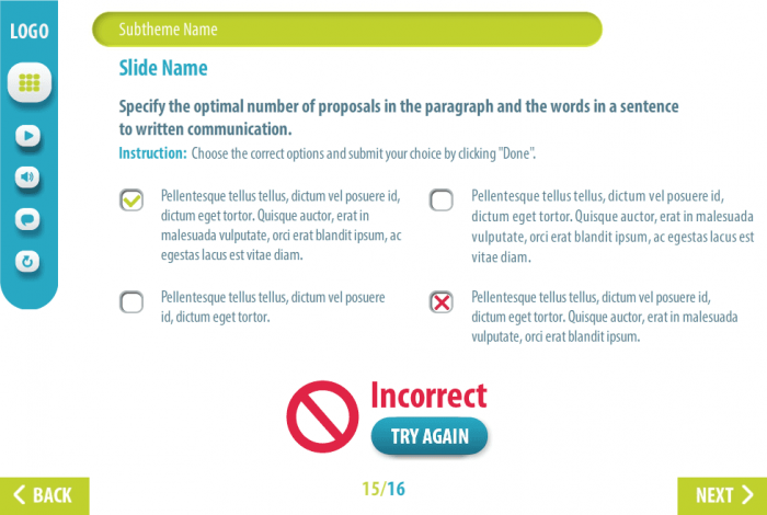 The course transfers results to LMS according to SCORM, AICC, Tin Can API standards. You may also download and view the course off-line using Articulate Mobile Player for Android and iOS, which are available on the AppStore and Google Play. The course starter template is compatible with Articulate Storyline 3 and 360 versions. Storyline Templates are among the most popular elearning templates due to a wide range of features and easy customization.