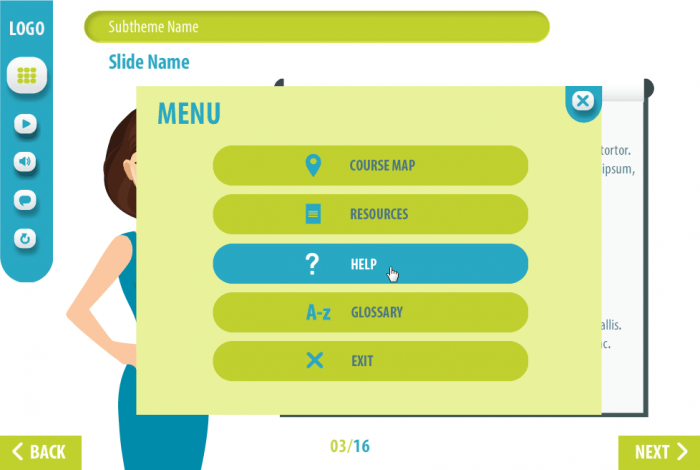 Storyline Course Template With Vertical Glossary Tab – is a perfect item for providing your own e-learning course to a big audience. Very easy to use – no special skills are required. Brightly composed and tastefully designed. Runs on Tablet and PC. Big navigation keys allow to view content on a small screens or mobile phones. It’s recommended to use on electronic devices with screen size 7 inches or more.