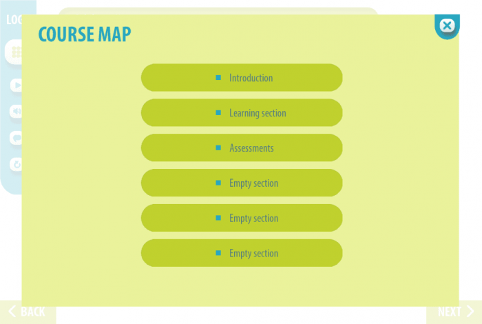 - Features: custom course map, custom navigation, custom voice/animation control, glossary, resources, closed captions, audio player, video player, quizzes which transfer data to LMS