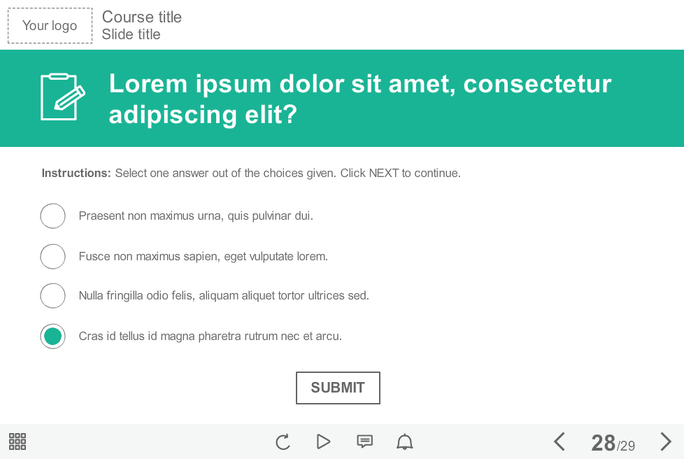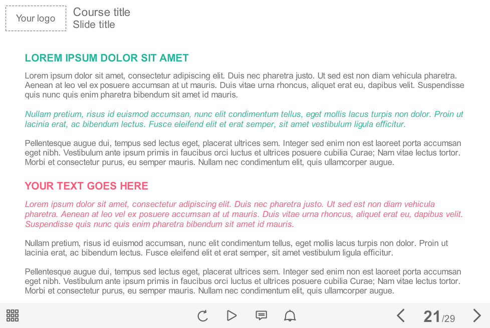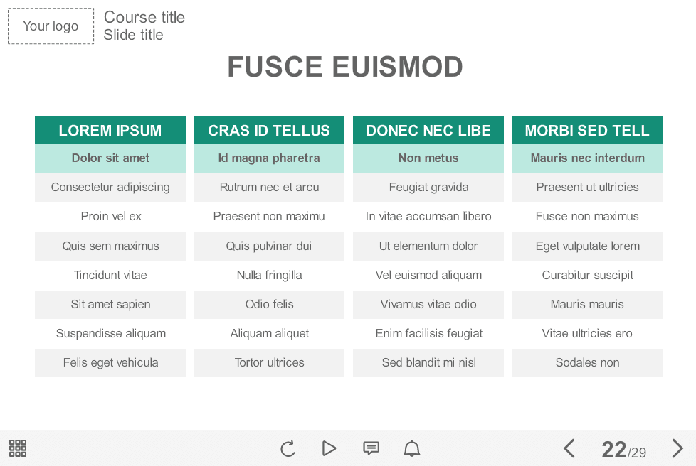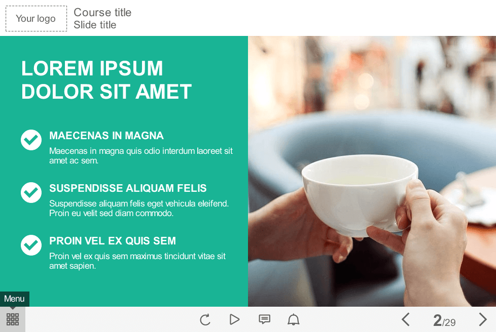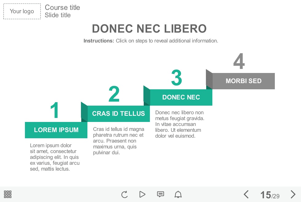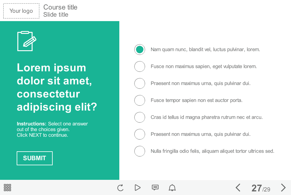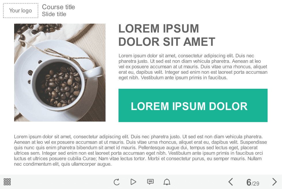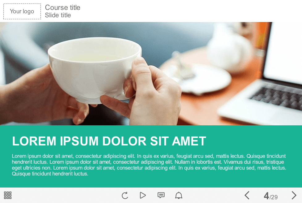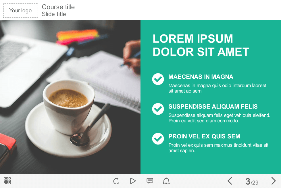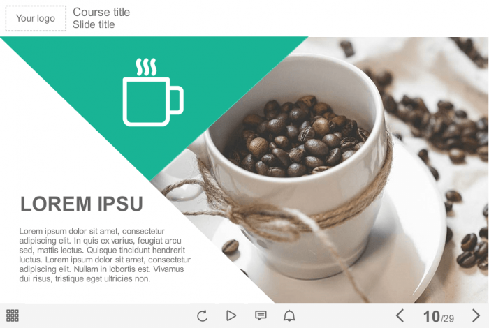 Designed in white and green colors, this template will definitely grab learners’ attention. Perfectly runs on both Tablet and PC. Navigation keys are located in the lower right part. It’s recommended to use on electronic devices with screens larger than 7 inches.