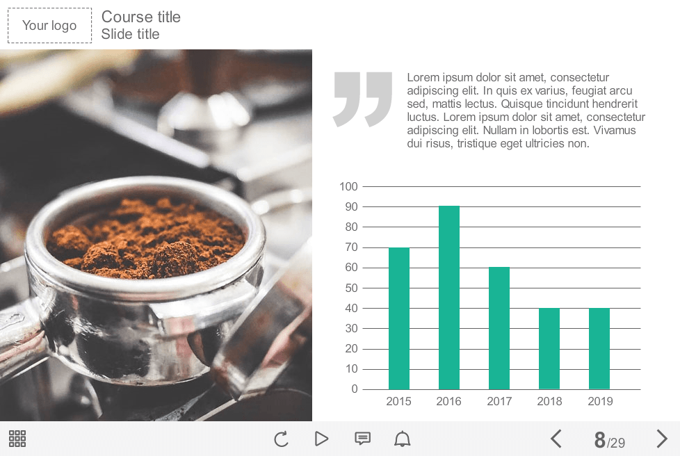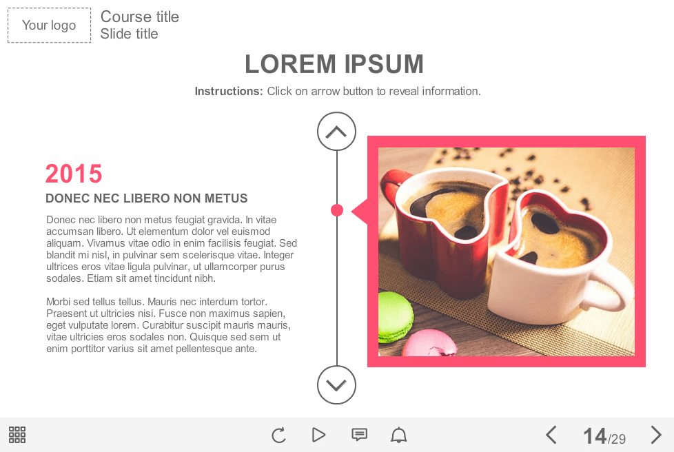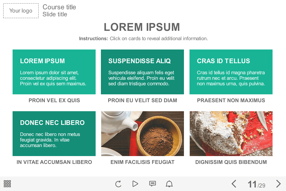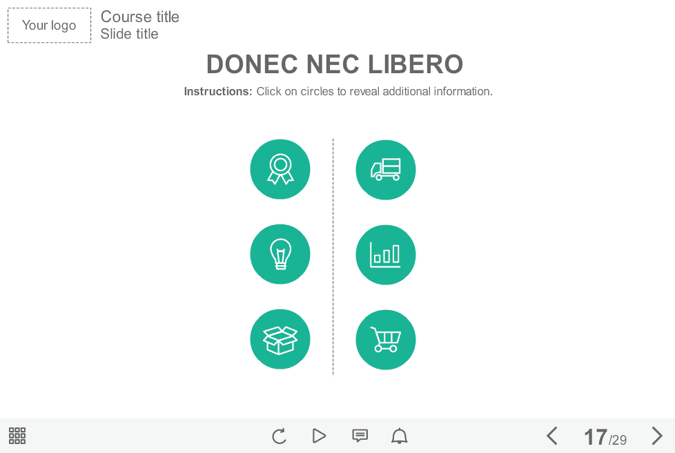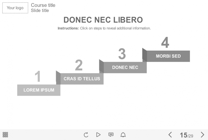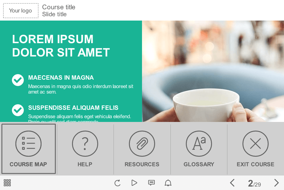 - Features: custom course map, custom navigation, custom voice/animation control, various versions of image slides, flip cards, tabs, infographics, vertical timeline, steps, dialogues, icon style interactions, integrated cutout characters, closed captions, audio player, video player, single choice quizzes