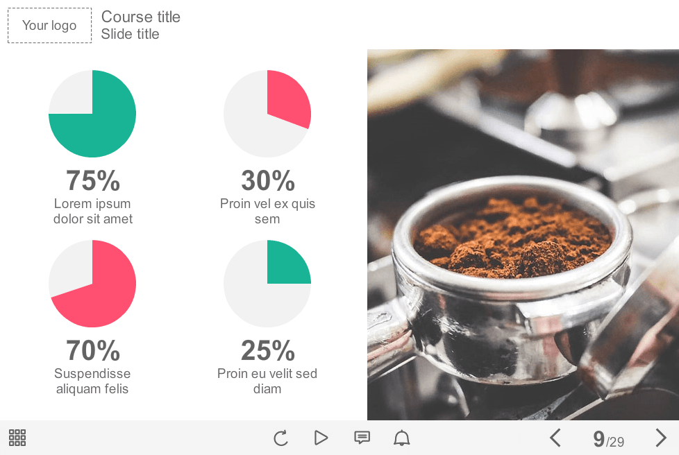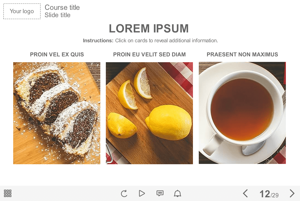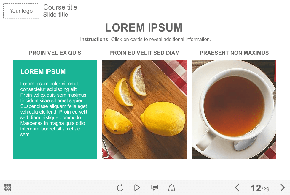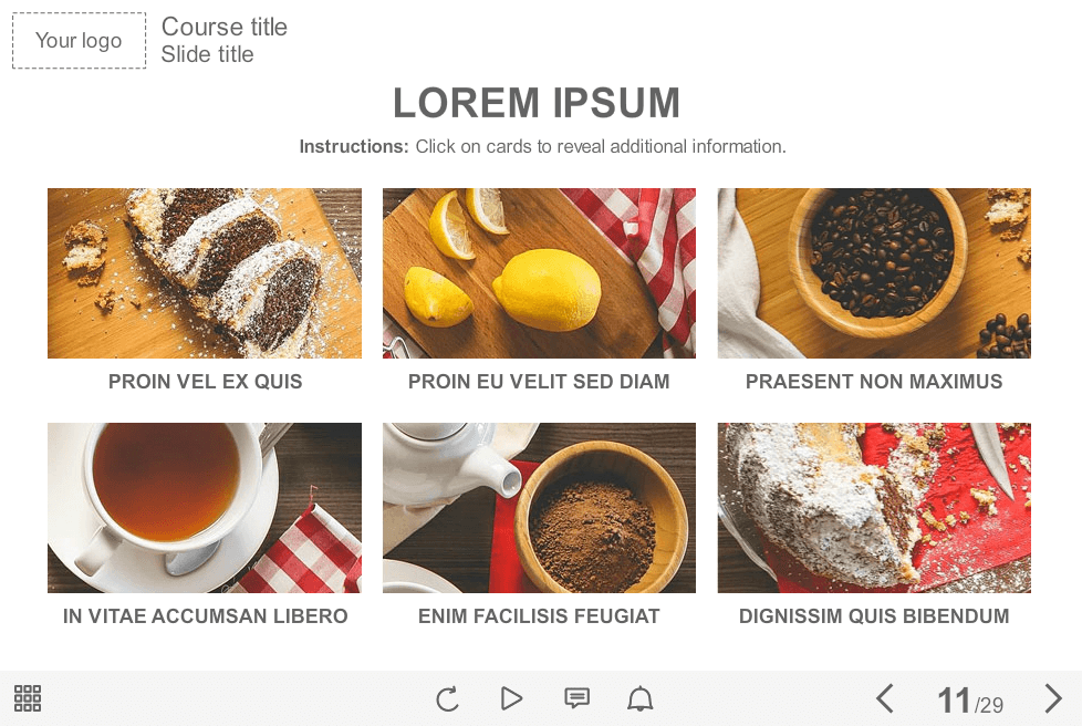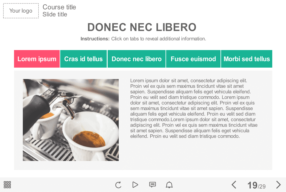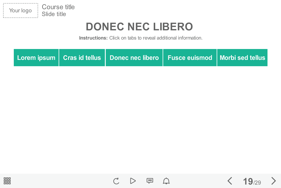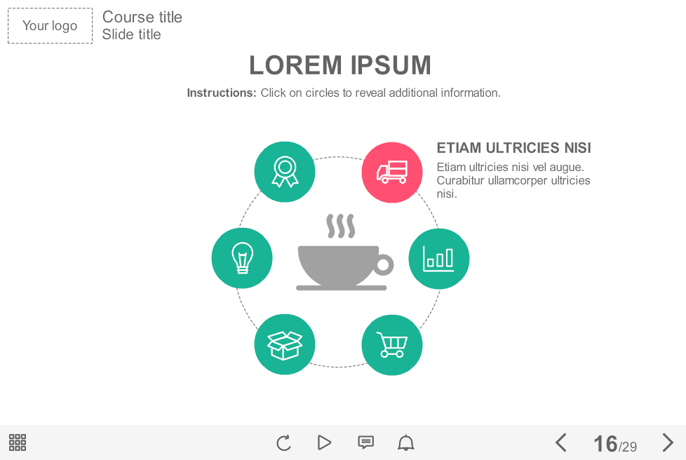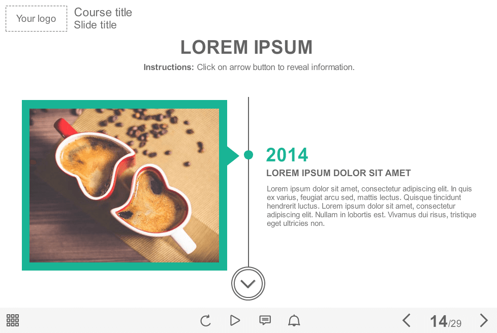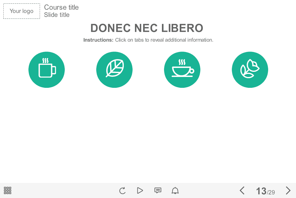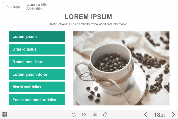 Storyline Course Template is a highly functional tool for creating elearning courses. This is a unique template as it includes a full range of storyline interactions, such as tabs, flip cards, timeline, etc.