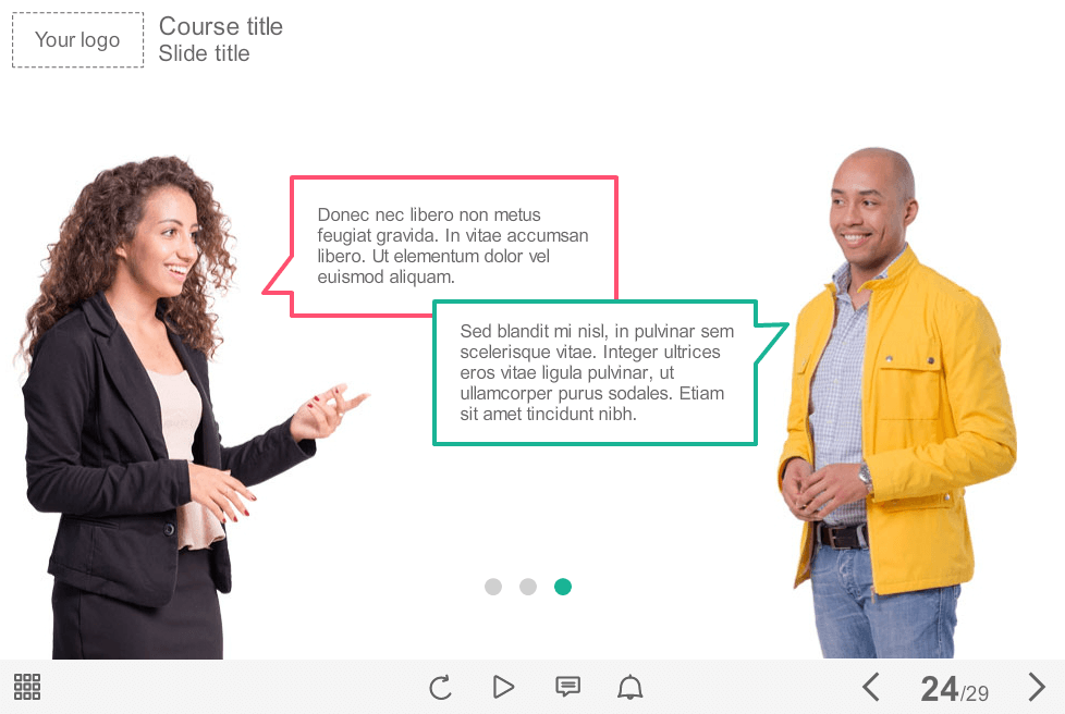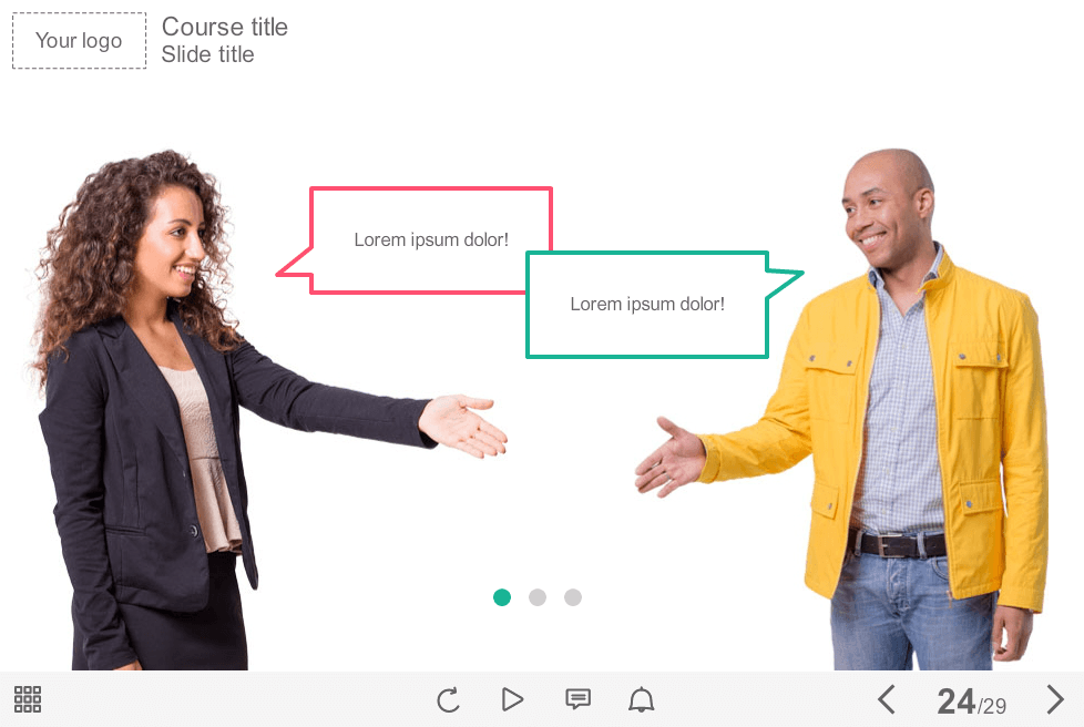 Storyline Template is composed of 29 sample slides in order to help you develop your own e-learning course. It contains dialogue slides between characters, various versions of image slides, infographics, flip cards, timeline, steps, dialogues, tabs and buttons slides to reveal additional info. Template is already designed and prepared for usage.