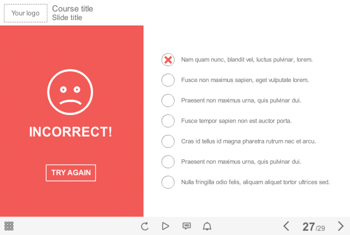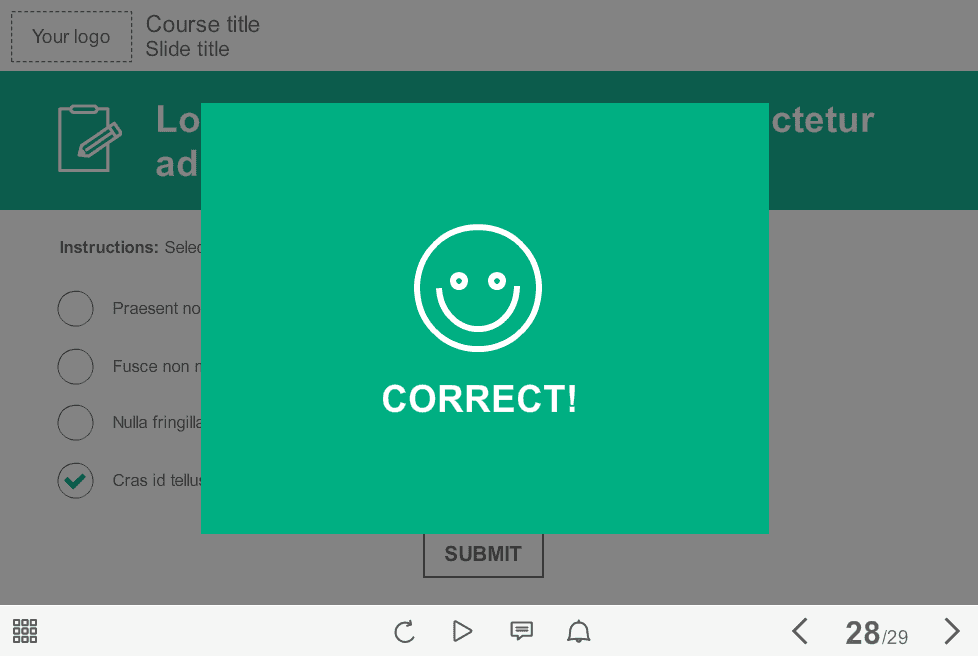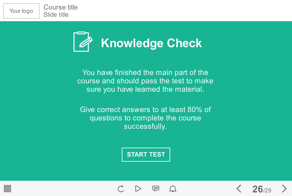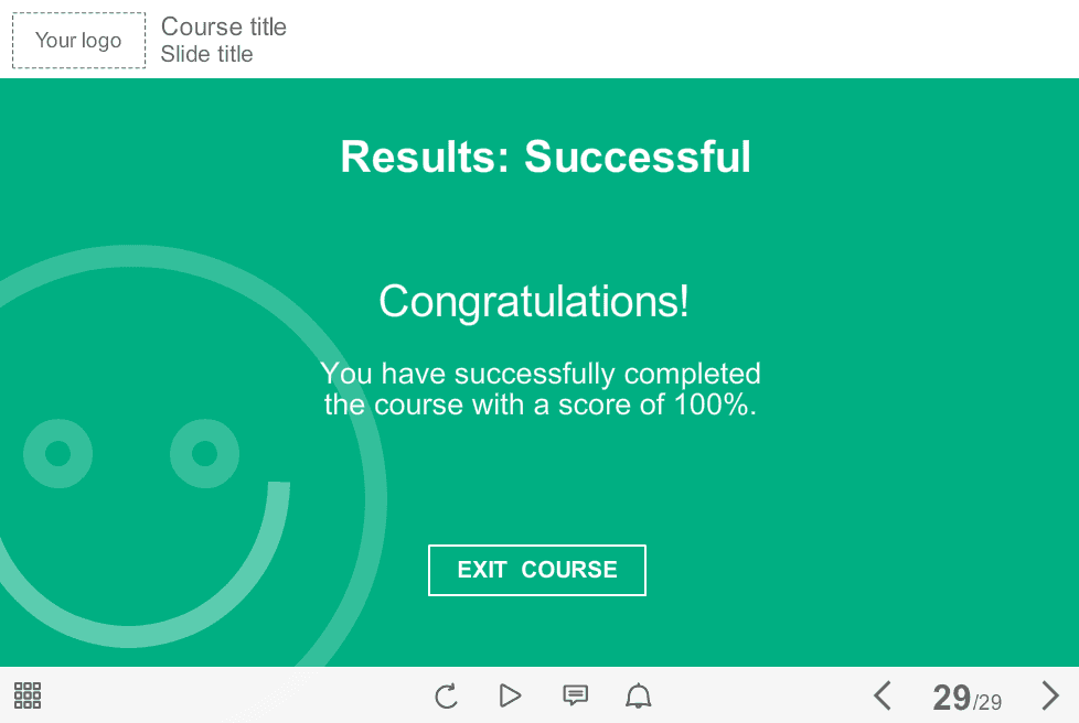 The course transfers results to LMS according to SCORM, AICC, Tin Can API standards. You can also download and view the course off-line using Articulate Mobile Player for Android and iOS, which are available on the AppStore and Google Play. The course starter template is compatible with Articulate Storyline 3 and 360 versions. Storyline Templates are among the most popular elearning templates due to a wide range of features and easy customization.