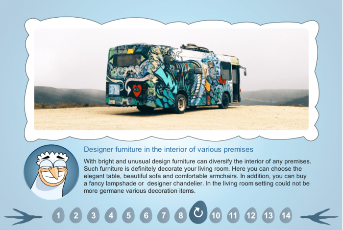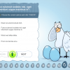 - Types of slides: titles, slides with cartoon-based chicken character, image + text slides, video slide, drag and drop slides, pre-test slide, single / multiple choice and yes / now questions, slide with the course results