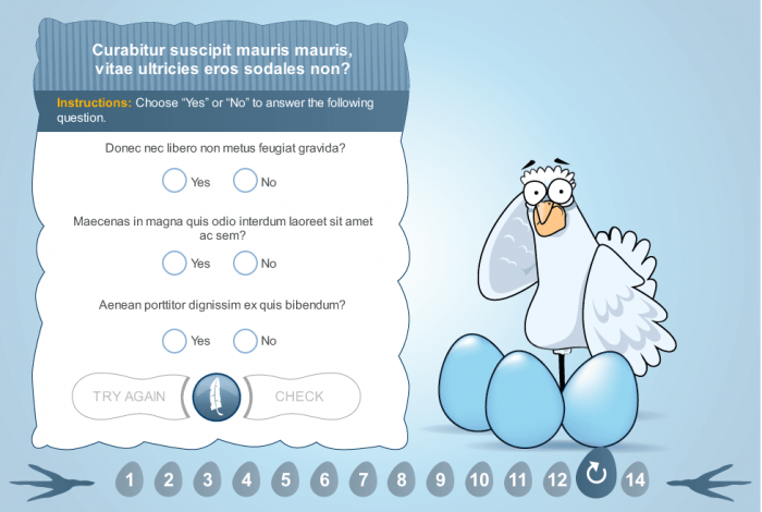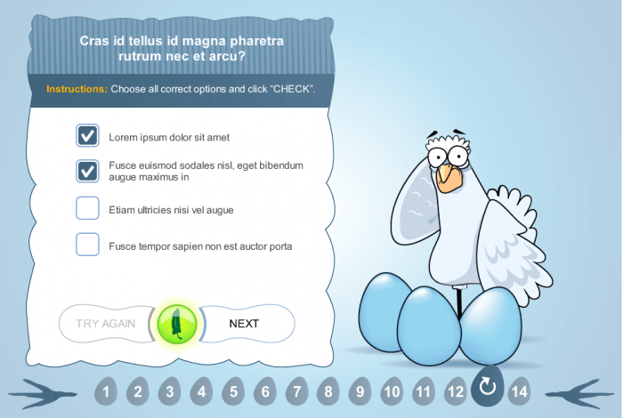 Chicken Adventure Template — Storyline Template. Absolutely stunning Articulate Storyline Template opens completely new opportunities in e-course development. This is the scenario-based elearning asset which is designed to diversify the process of the e-course development. The template consist of several interactive slides that present the fascinating visual story where users are supposed to have an adventure with their chicken friend and must help this funny cartoon creature to complete all tasks successfully on her way to the final course point. The unique storyboard has a multi-purpose logical sequence, which is universal for the vast majority of learning situations.