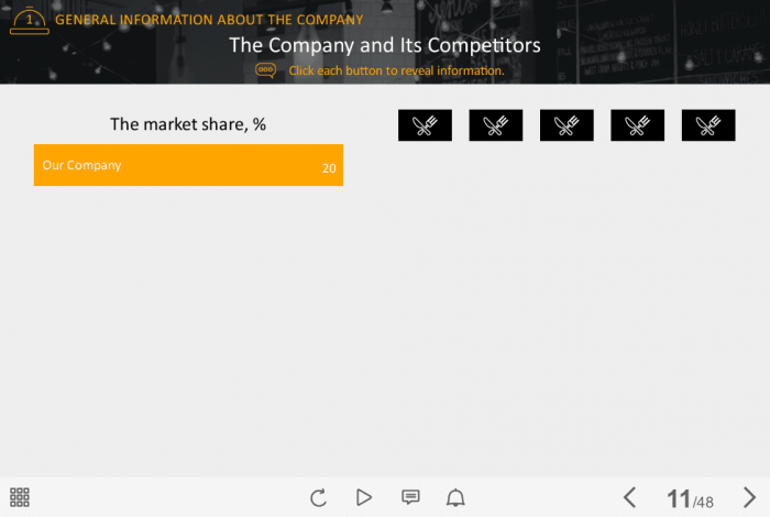 Food Industry Welcome Course Starter Template — Articulate Storyline. It’s a highly-functional elearning asset designed for creating induction training for the new cafe and restaurant employees. It will surely help you to provide a positive and consistent first experience for all new starters. The template launches well on both PC and tablet. The navigation keys are located in the lower right-part of the screen. Due to the large clickable buttons, it will be convenient to use the template on mobile devices. The recommended screen diagonal for comfortable usage is at least 7 inches.