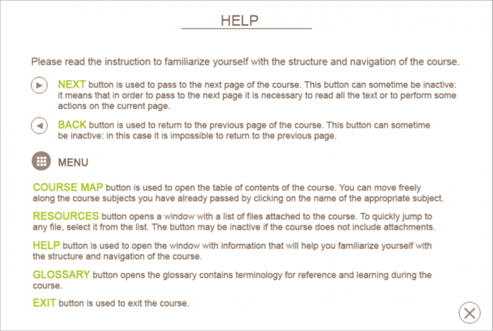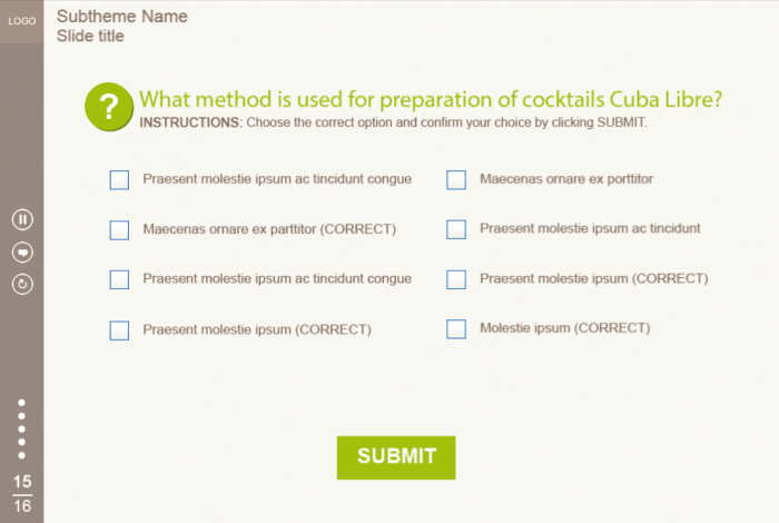 • Types of slides: title, image + text, audio slide, video slide, slide with the character, pre-test slide, slide with the course results, single and multiple choice quizzes