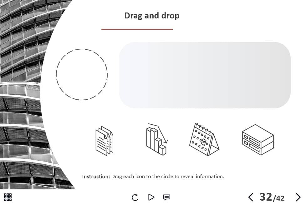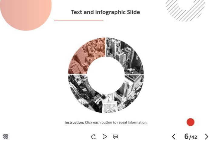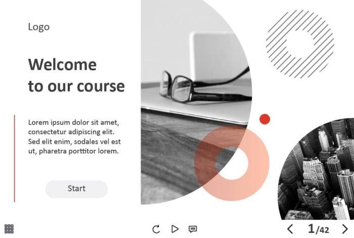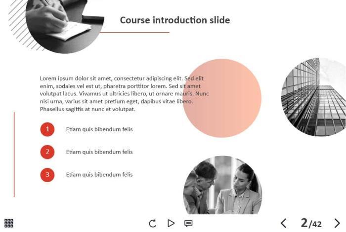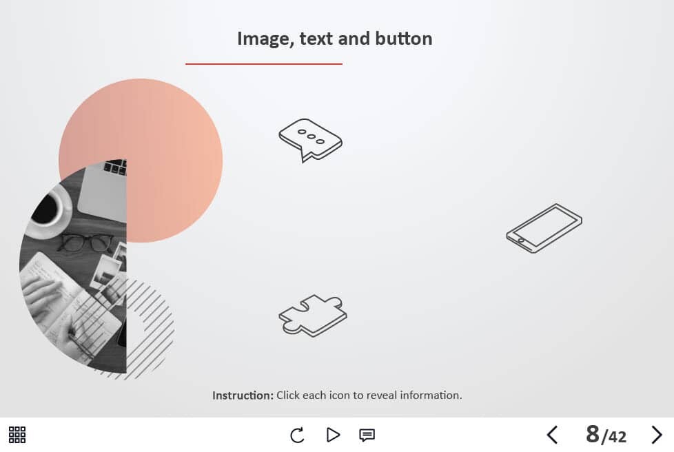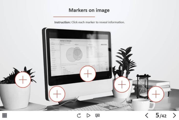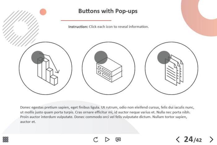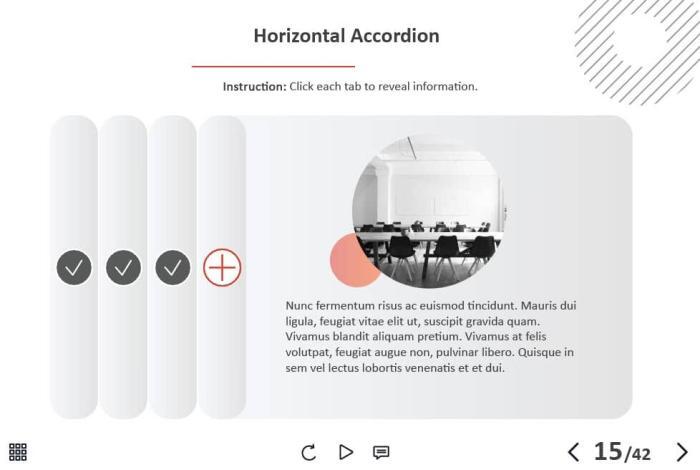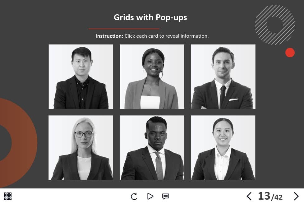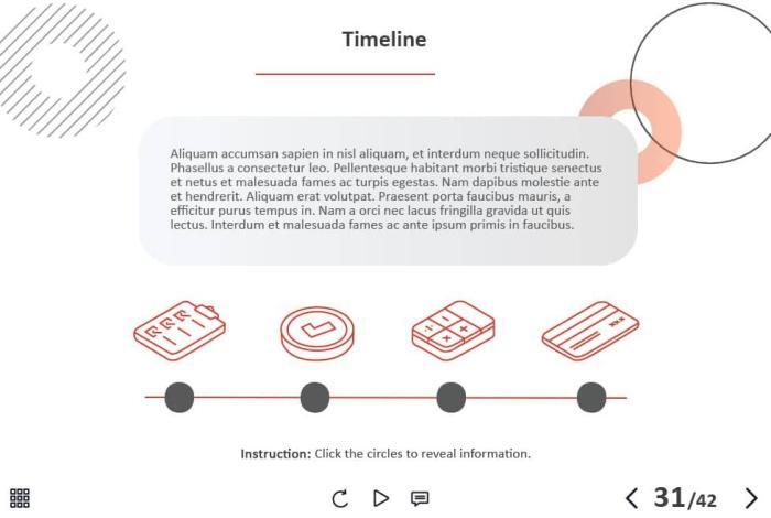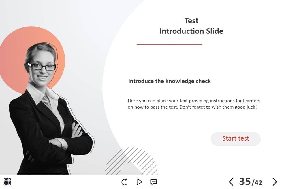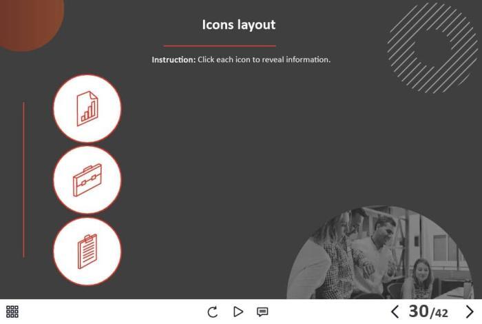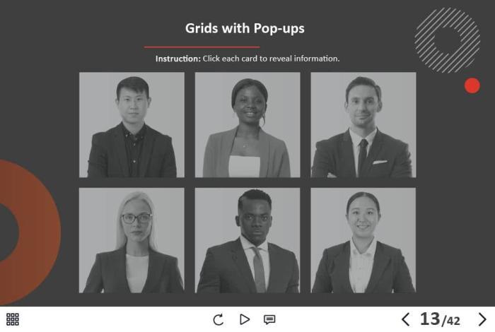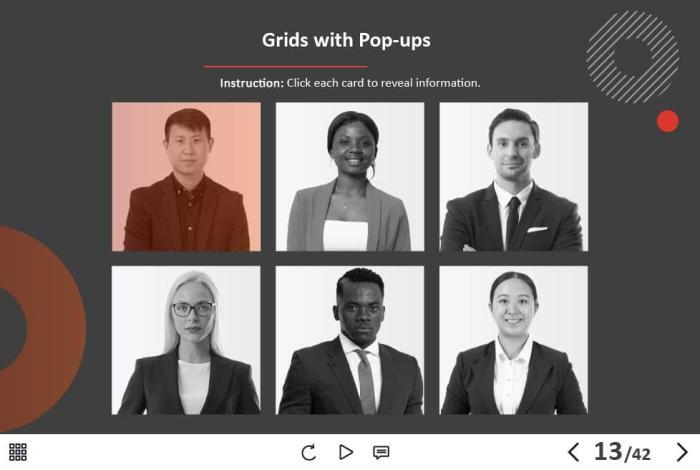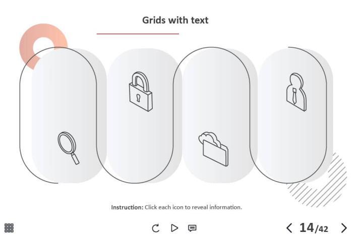 - Types of slides: title, quote, video slide, slides with cutout people photos, slides with text + images, flip cards, pop-ups, tabs, infographics, timelines, steps, grids, accordions, slideshows, drag and drops, pre-test slide, slide with the course results