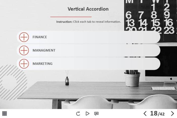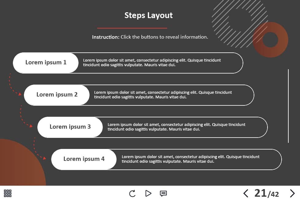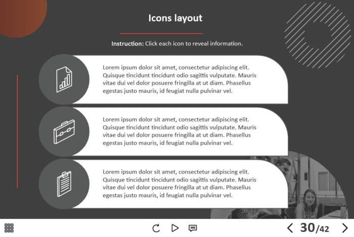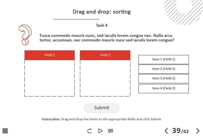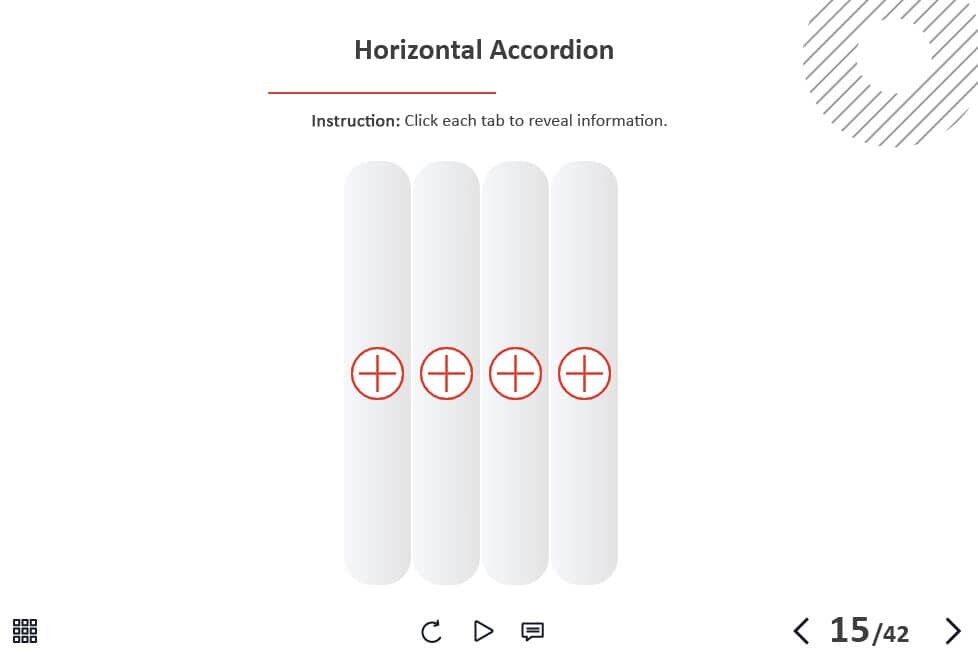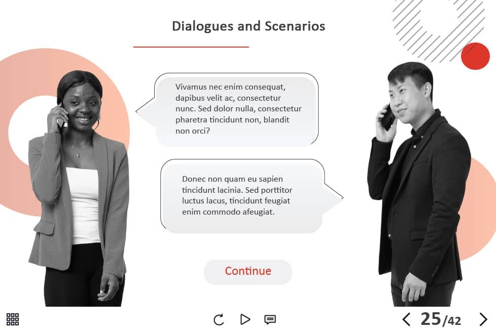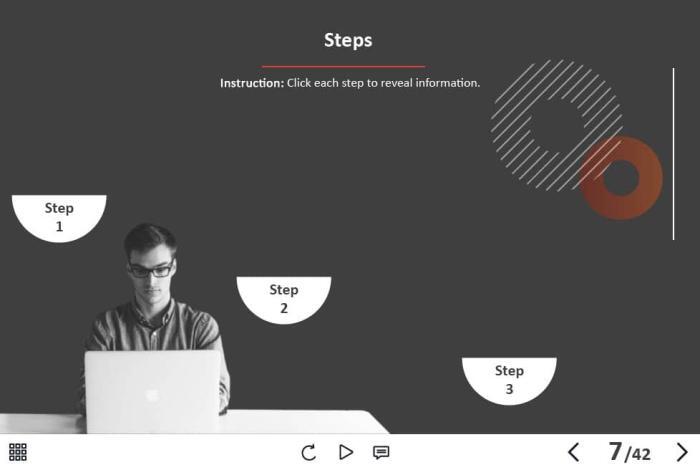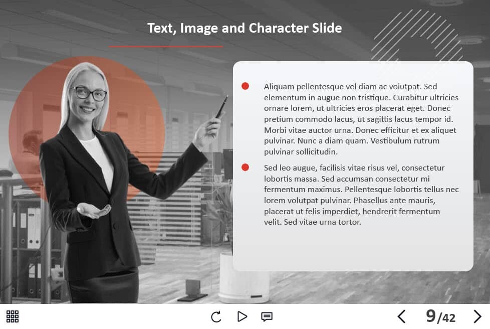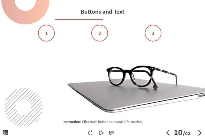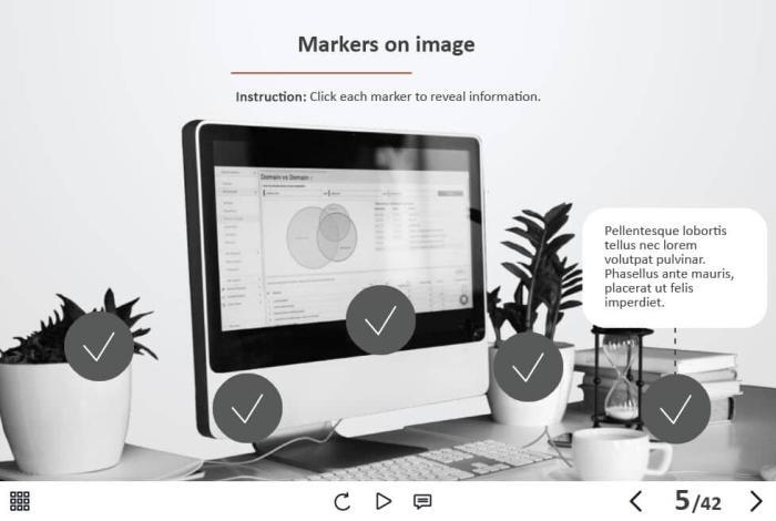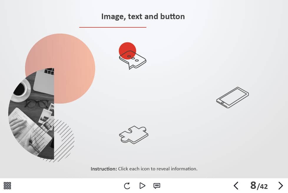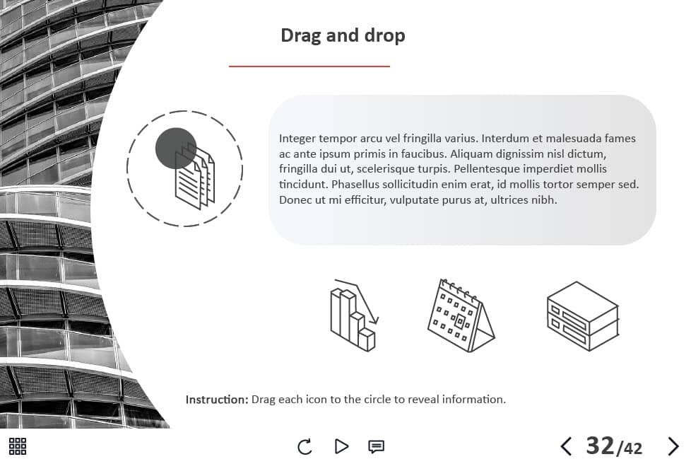 - Types of slides: title, quote, video slide, slides with cutout people photos, slides with text + images, flip cards, pop-ups, tabs, infographics, timelines, steps, grids, accordions, slideshows, drag and drops, pre-test slide, slide with the course results
