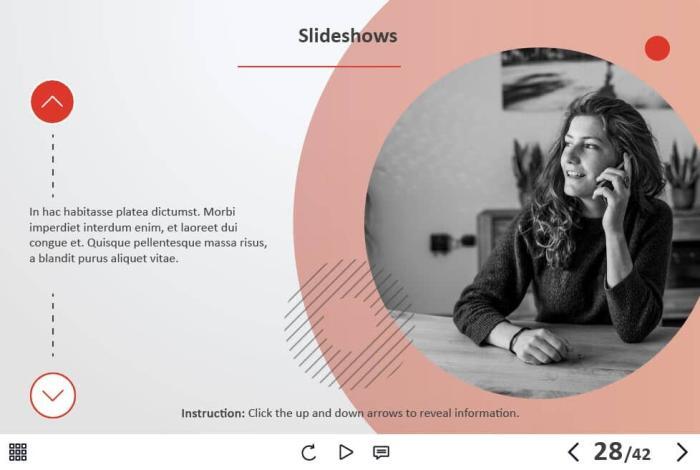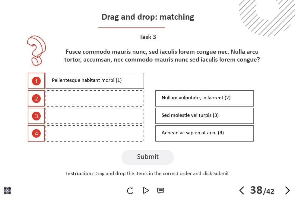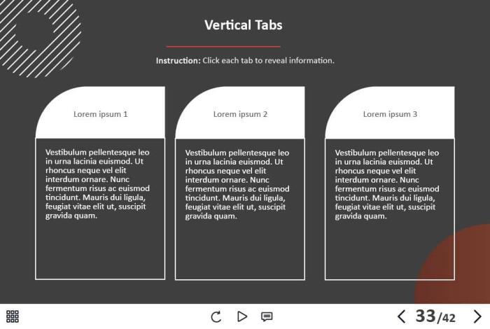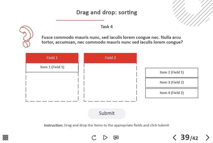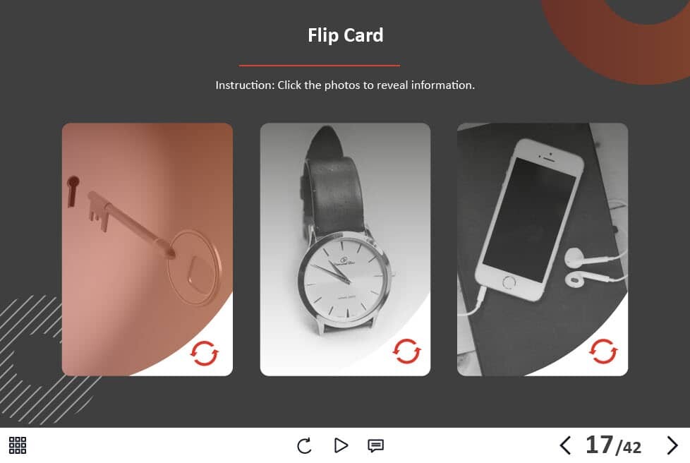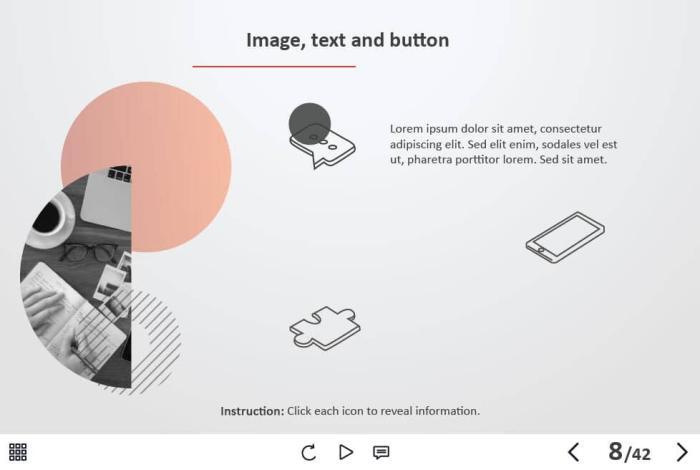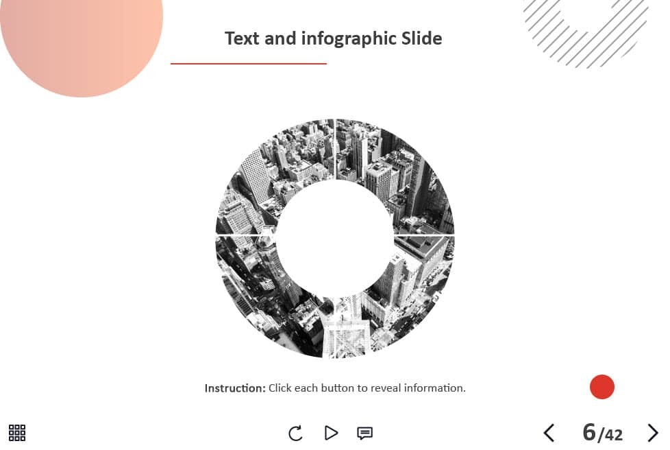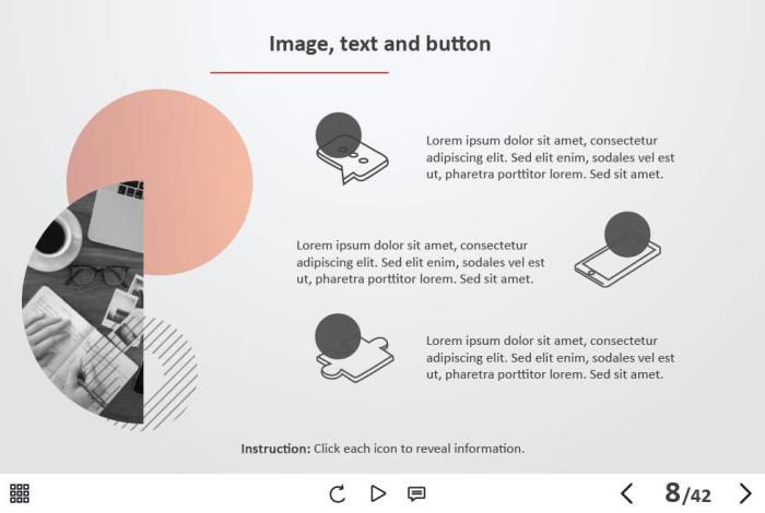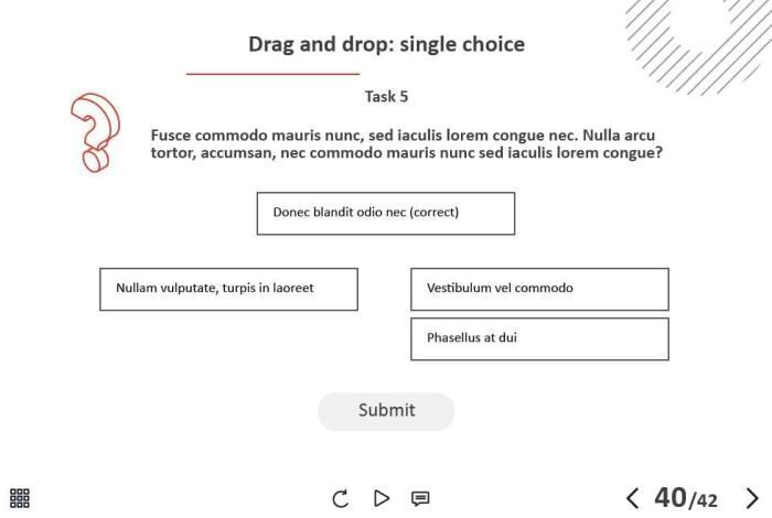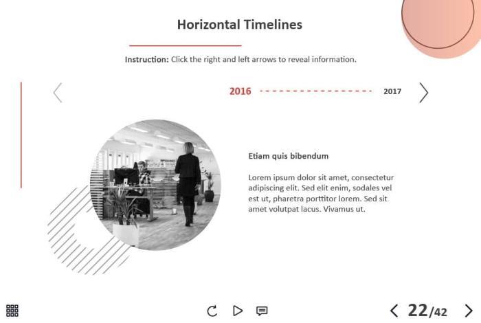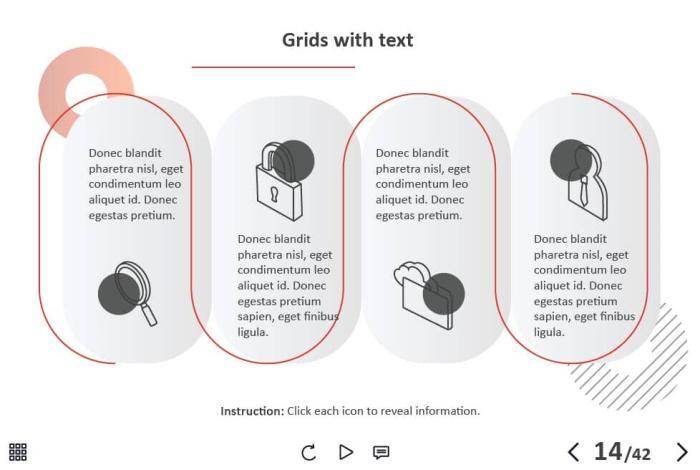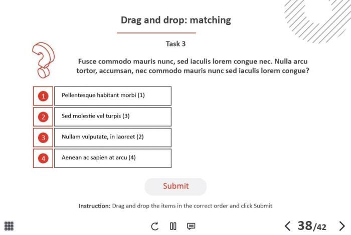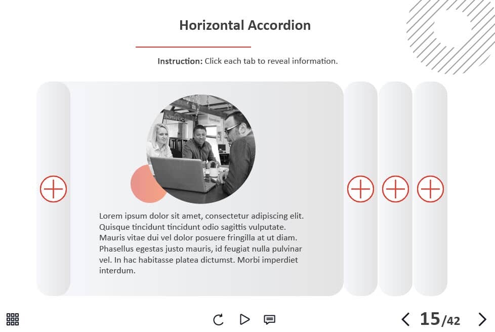 - Types of slides: title, quote, video slide, slides with cutout people photos, slides with text + images, flip cards, pop-ups, tabs, infographics, timelines, steps, grids, accordions, slideshows, drag and drops, pre-test slide, slide with the course results