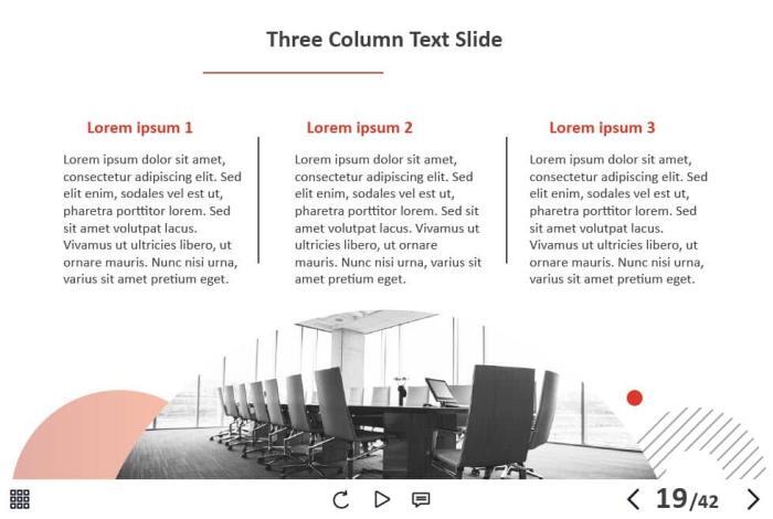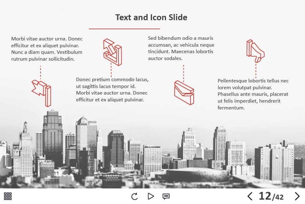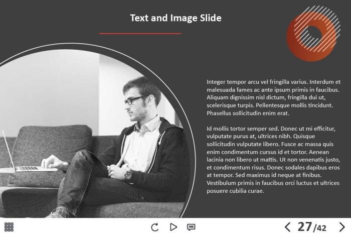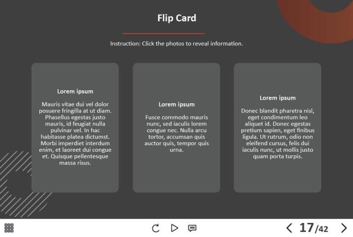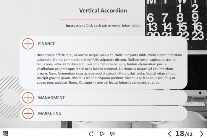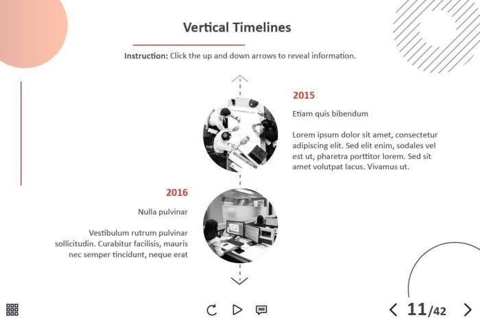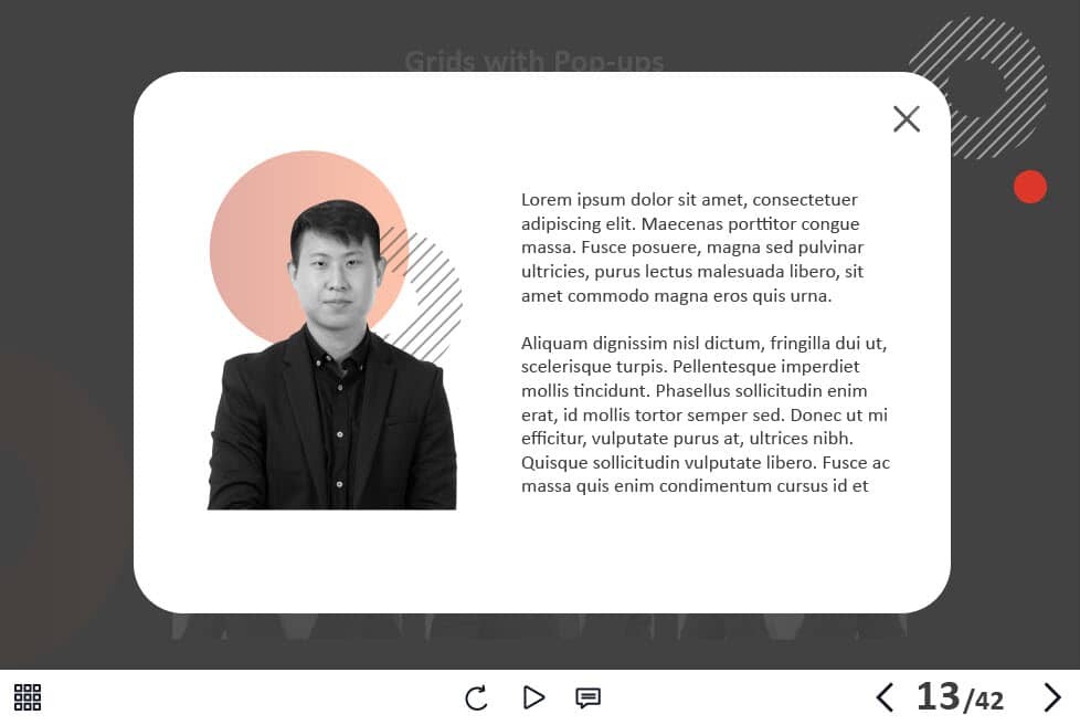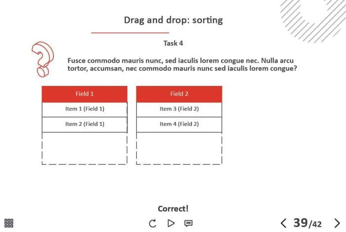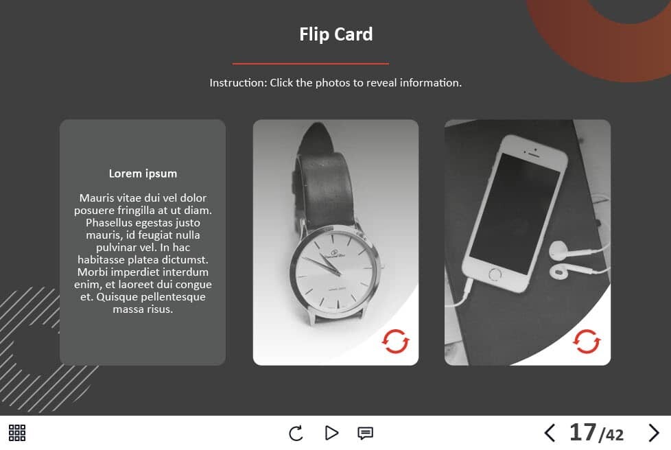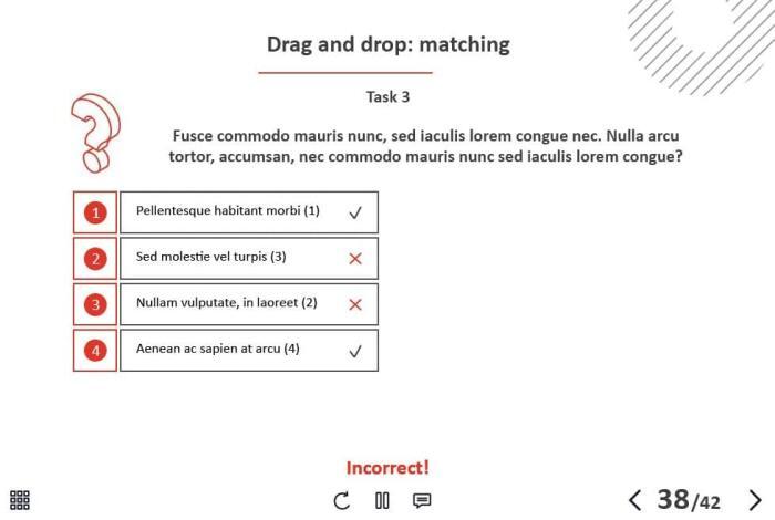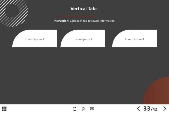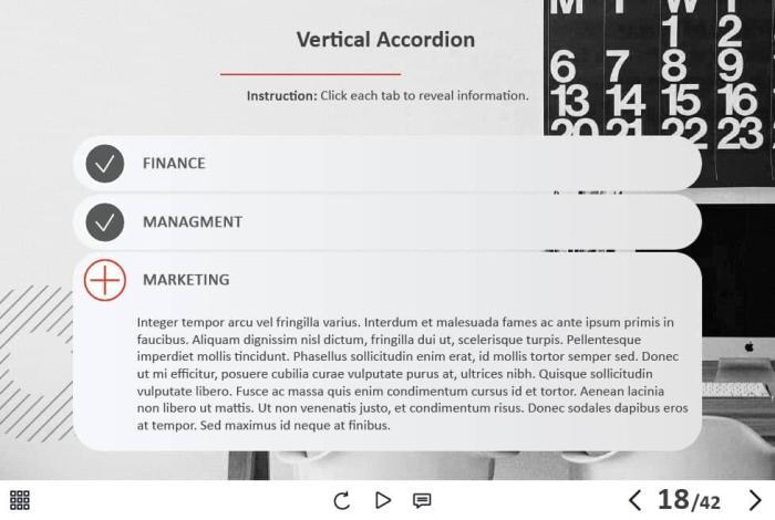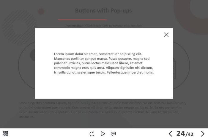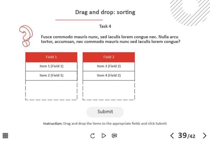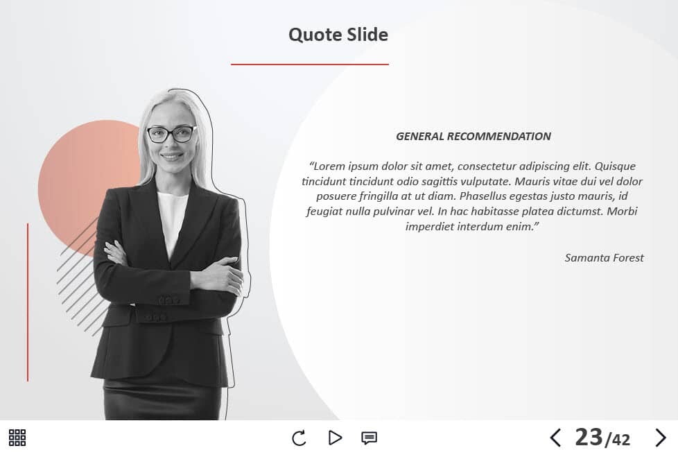 - Types of slides: title, quote, video slide, slides with cutout people photos, slides with text + images, flip cards, pop-ups, tabs, infographics, timelines, steps, grids, accordions, slideshows, drag and drops, pre-test slide, slide with the course results