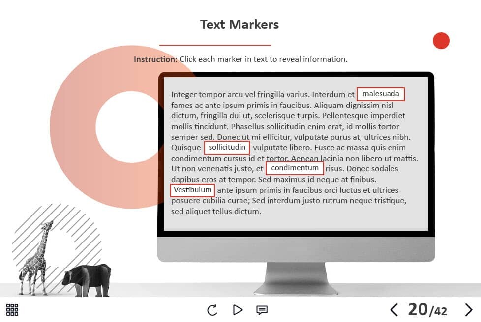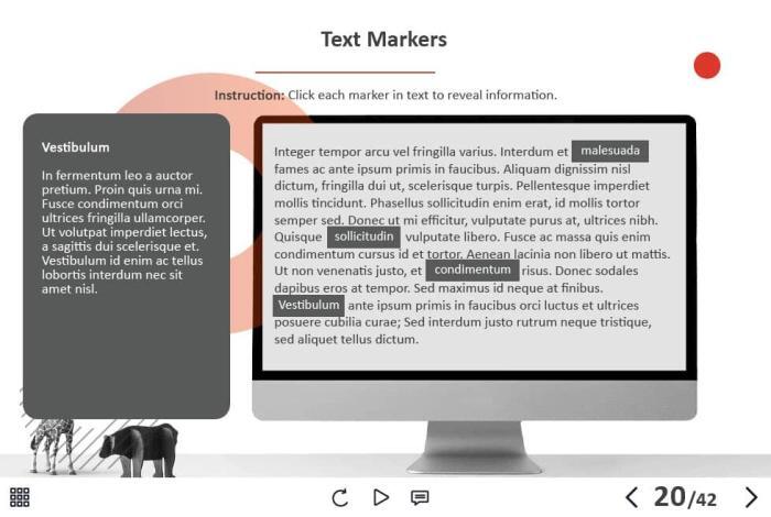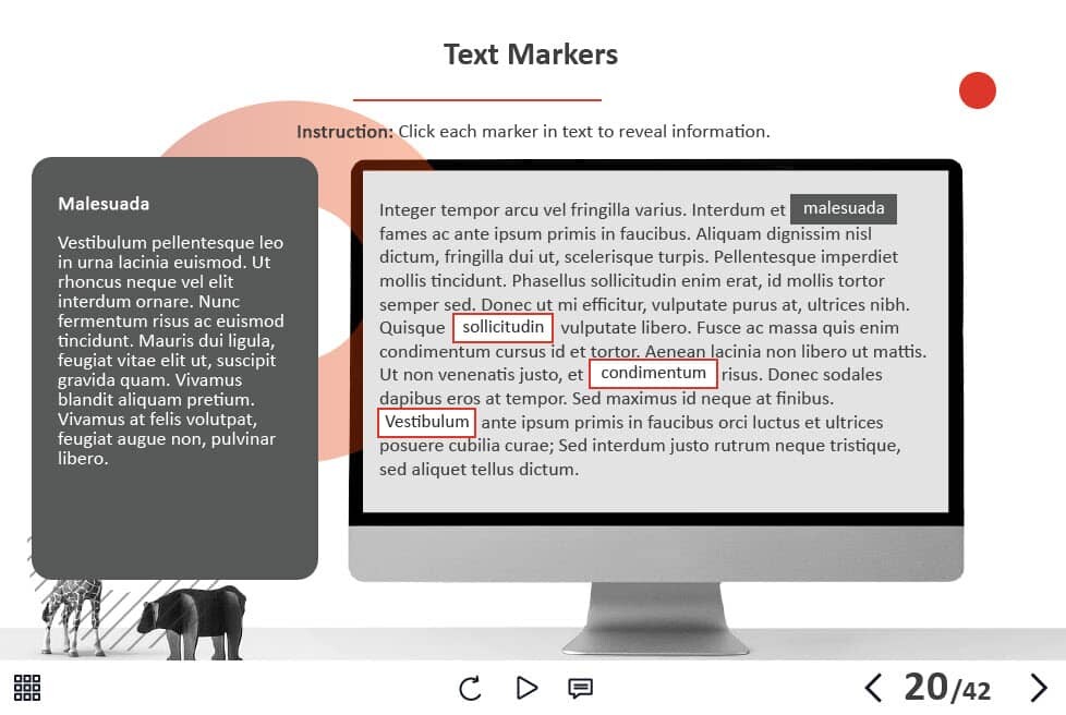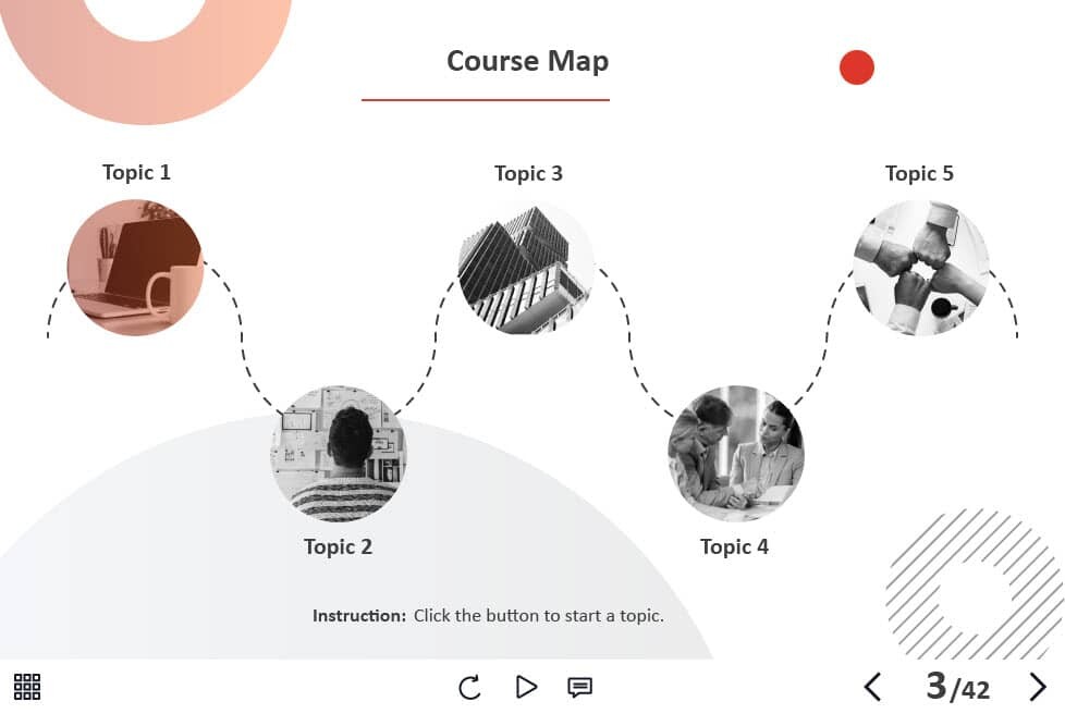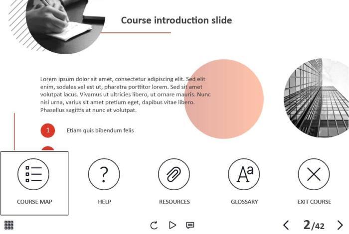 - Features: custom course map, custom navigation, custom voice/animation control, various versions of interactive slides, integrated cutout characters, closed captions, audio player, video player, single and multiple choice quizzes