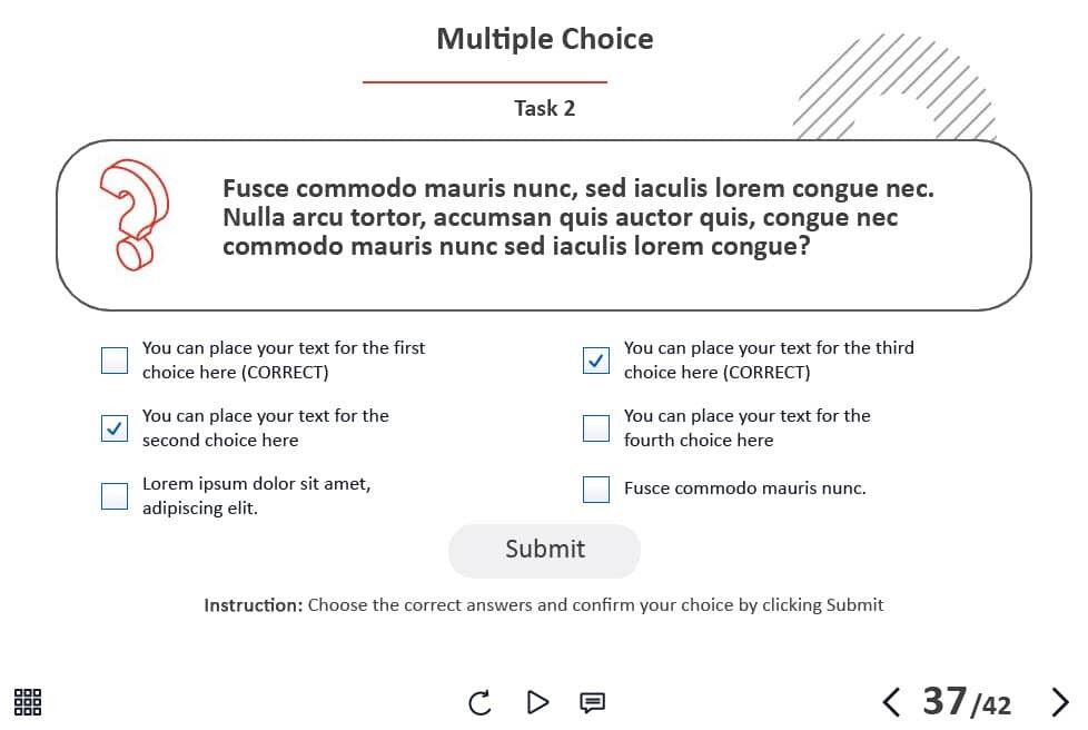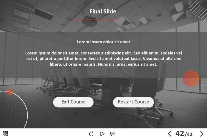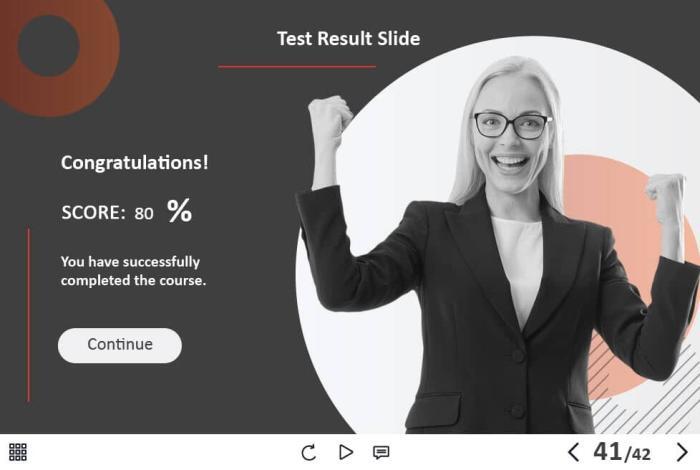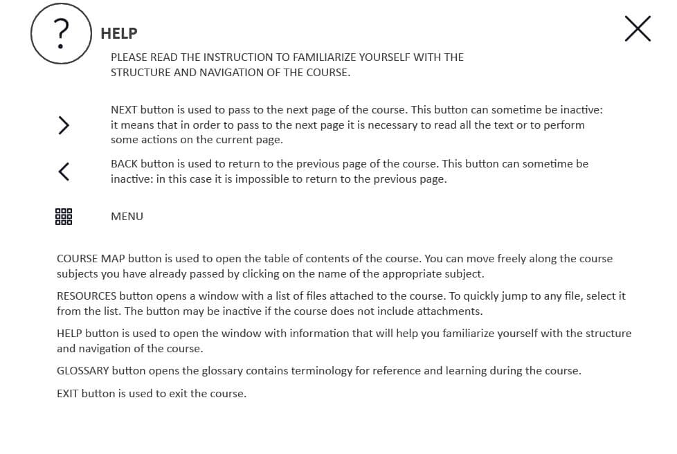 The course template is developed with Adobe Captivate 2019. Can be launched on both PC and tablet. The navigation keys are located in the lower right part of the screen. It will be convenient to use the template on mobile devices with touchscreens larger than 7 inches.