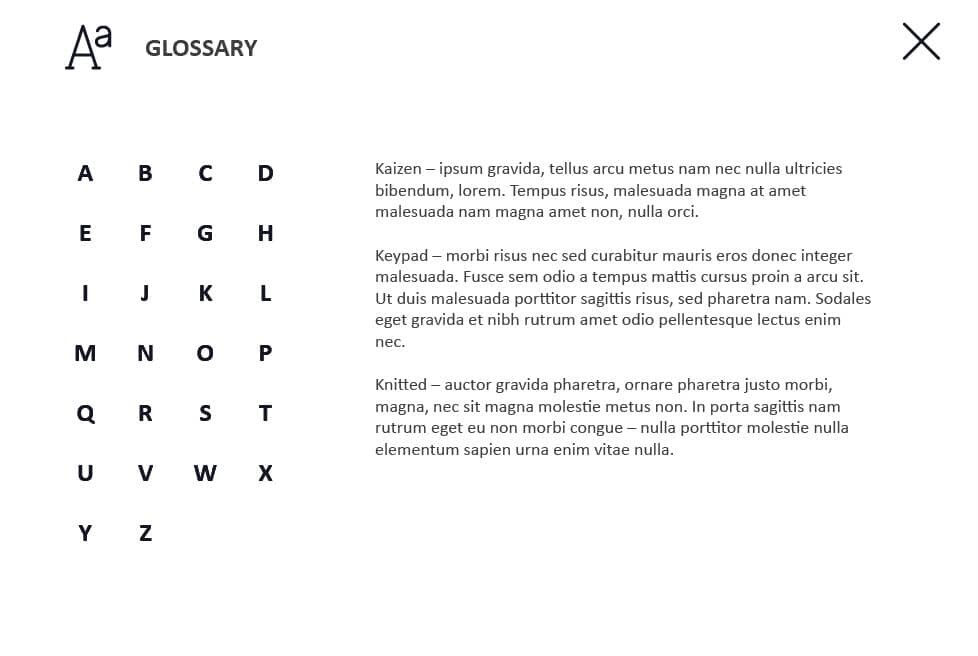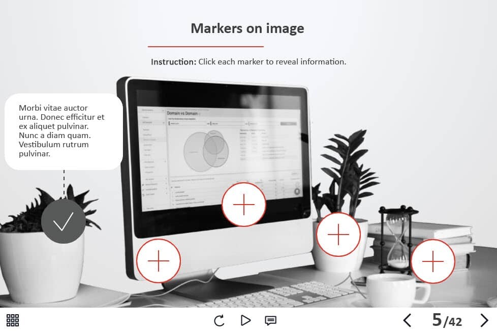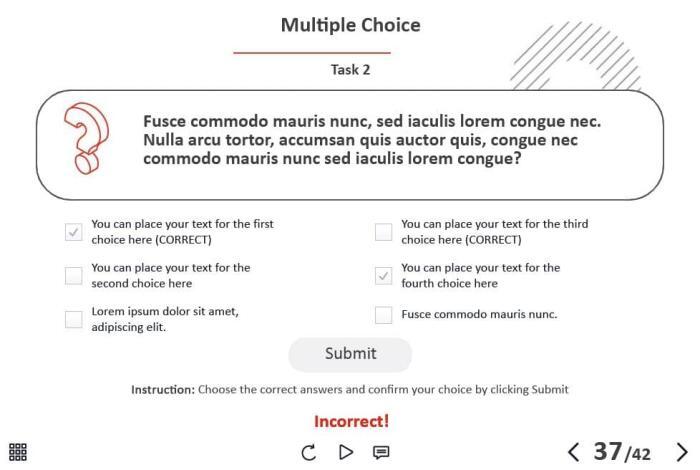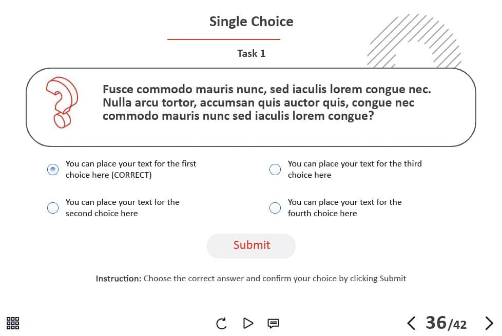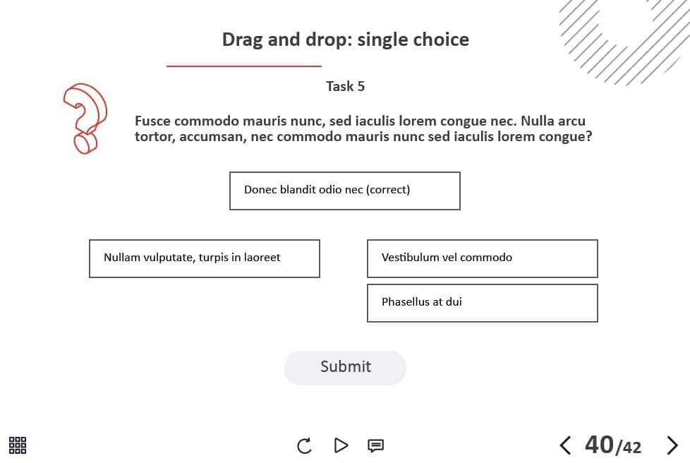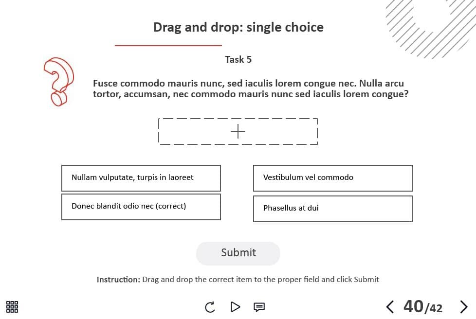 The course starter template is composed of 42 layouts and interactions in order to help you develop your own training course and to improve the learner’s knowledge. It contains various versions of interactive slides such as steps, pop-ups, tabs, and many others that are created to reveal the course information. The knowledge check module includes 5 tasks such as questions with single and multiple answer options, and drag and drop quizzes. It transfers results to LMS according to SCORM, AICC, Tin Can API standards.
