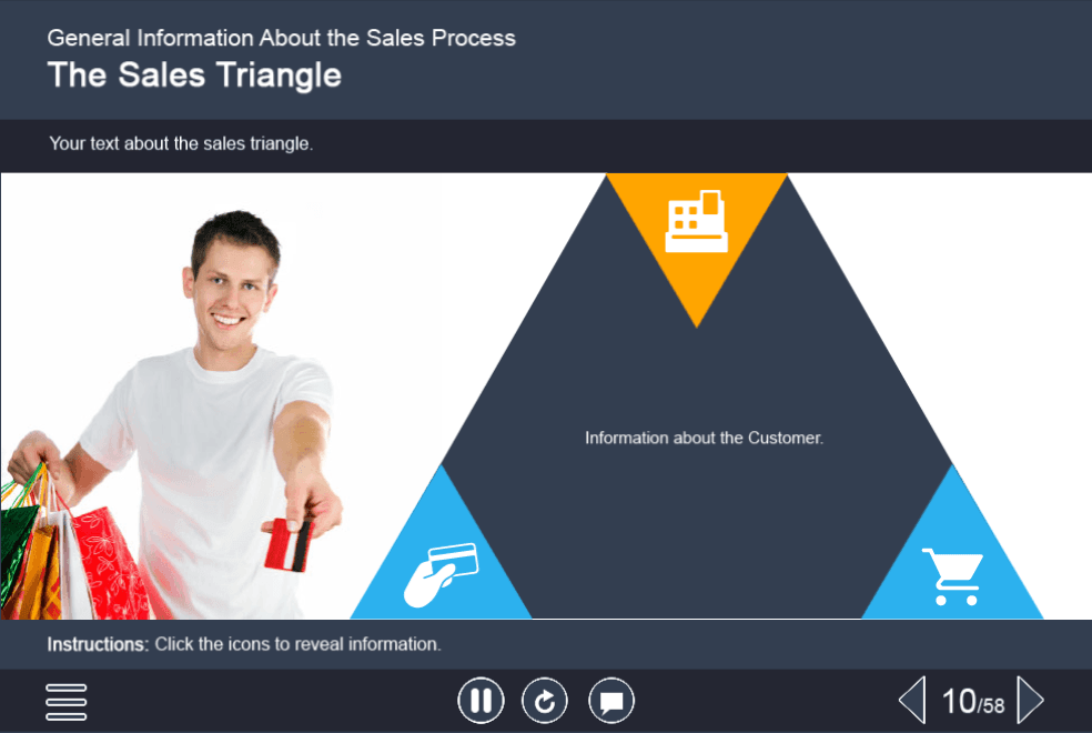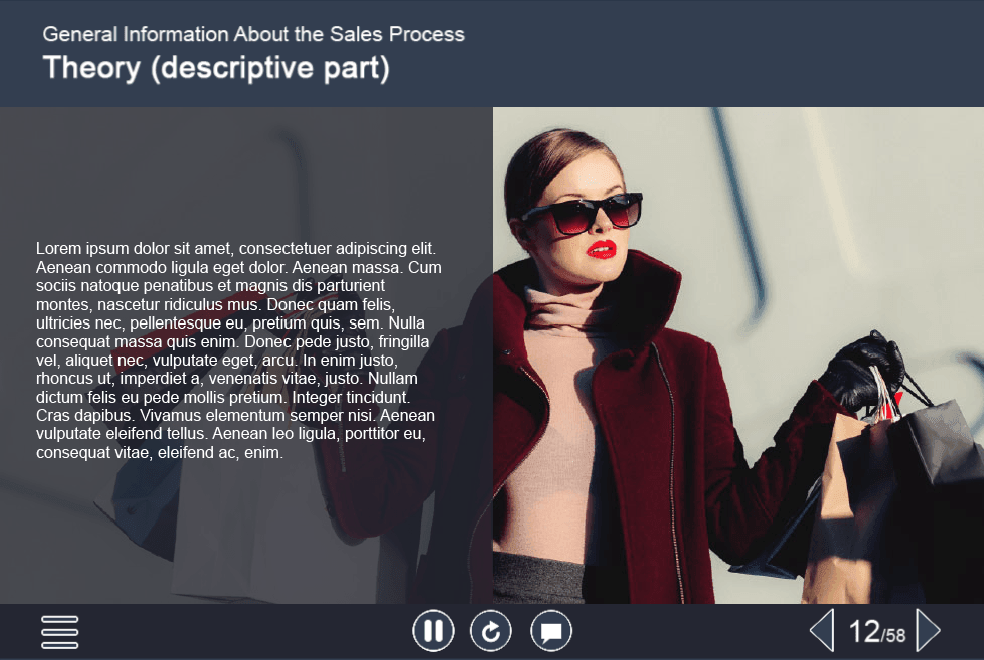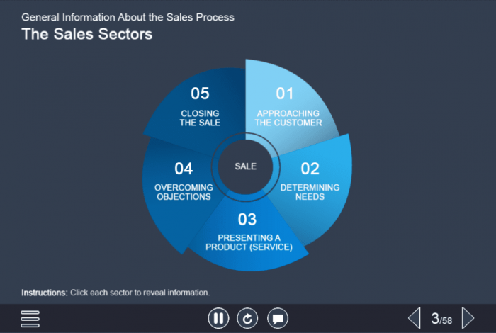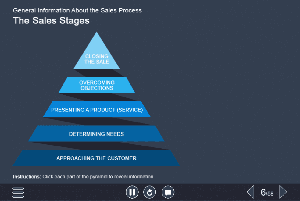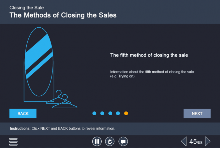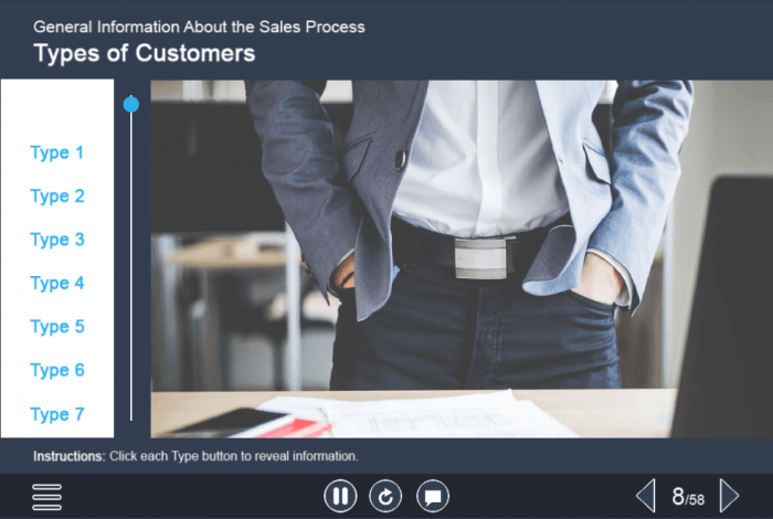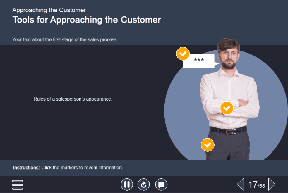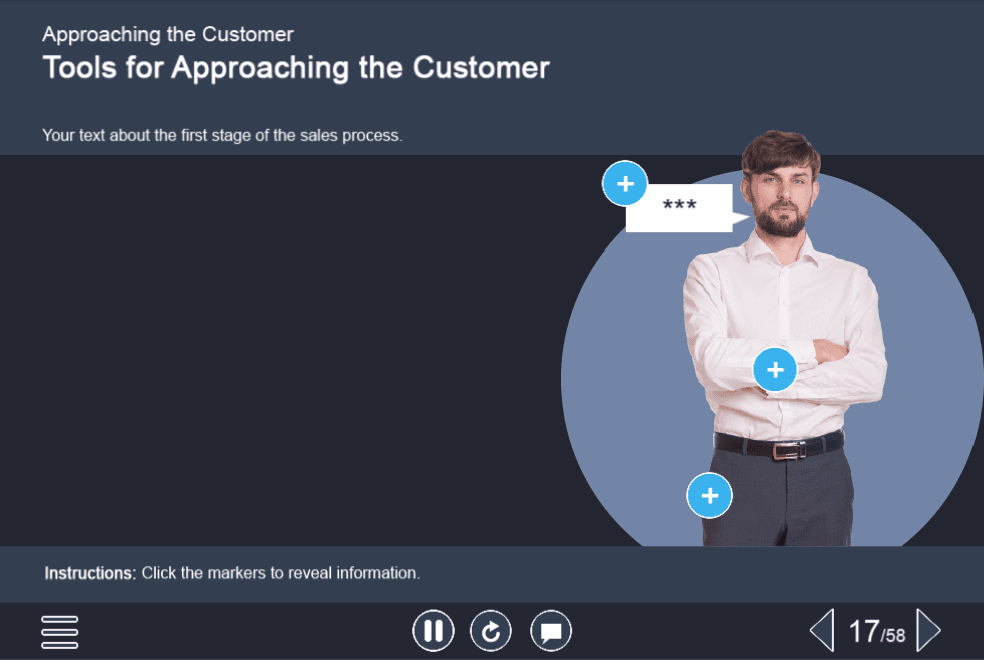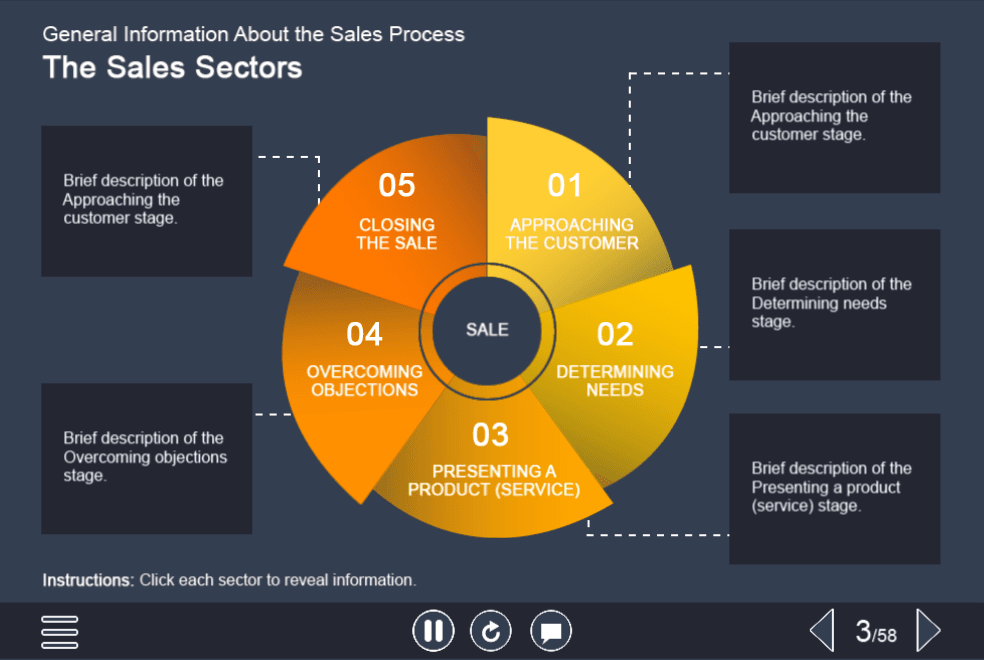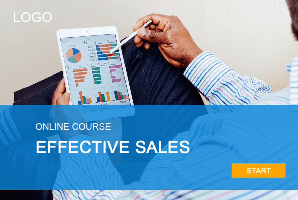 Effective Sales Course Starter Template — Adobe Captivate. The highly-functional elearning asset designed for creating training courses to improve the effectiveness of sales professionals. It can be launched on both PC and tablet. The navigation keys are located in the lower right part of the screen. Due to the large clickable buttons, it will be convenient to use the template on mobile devices with touchscreens larger than 7 inches.