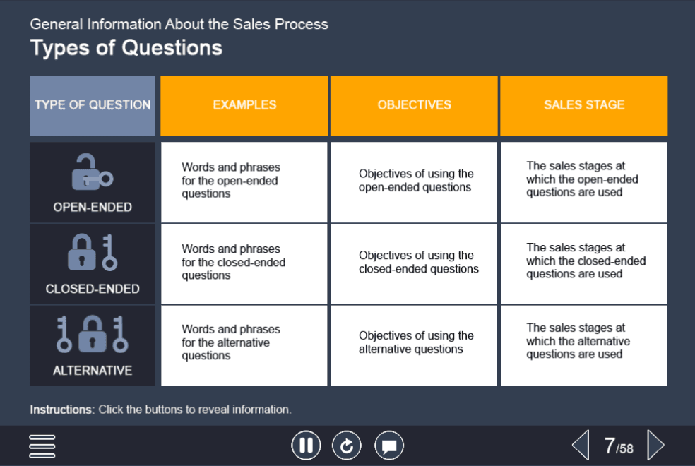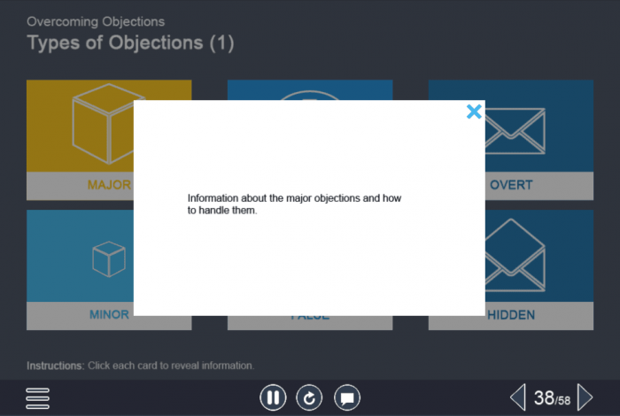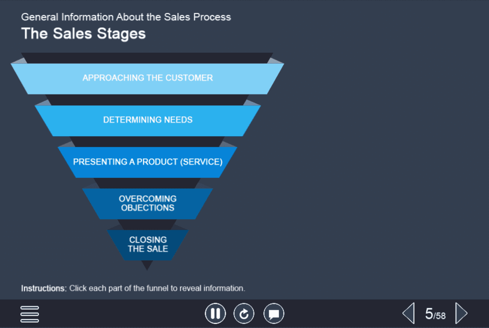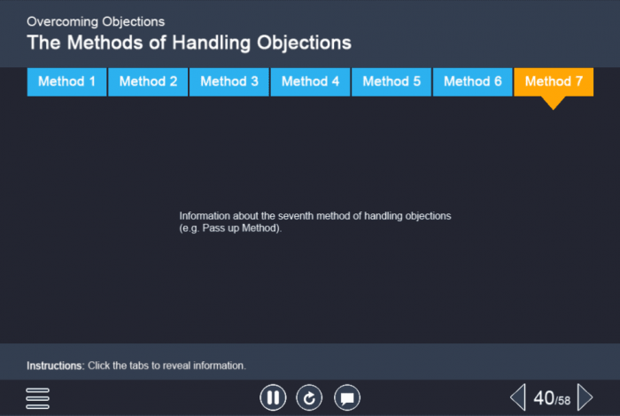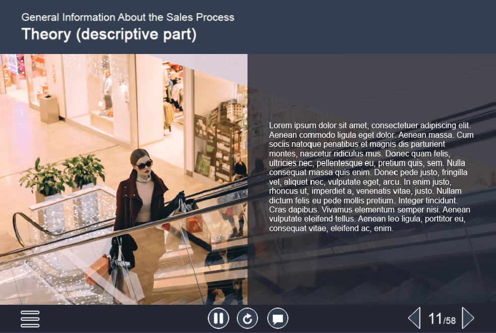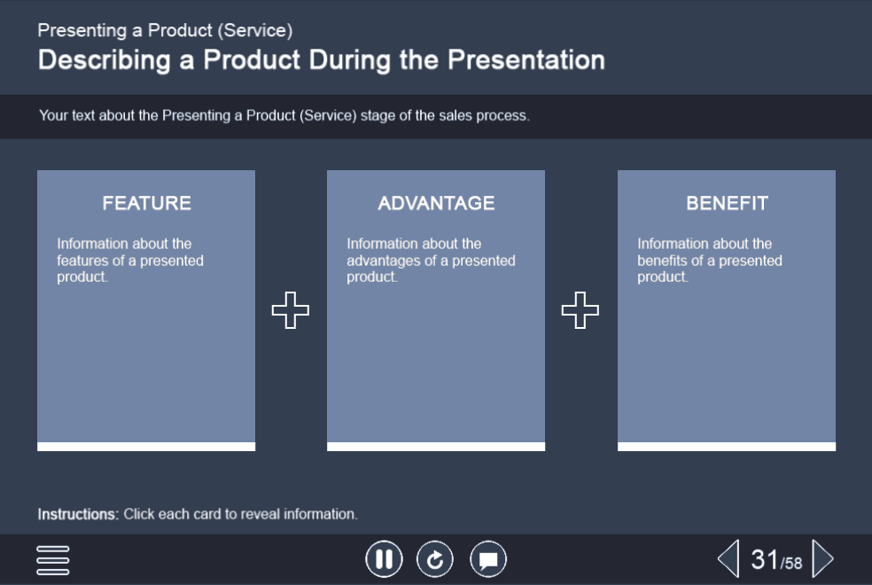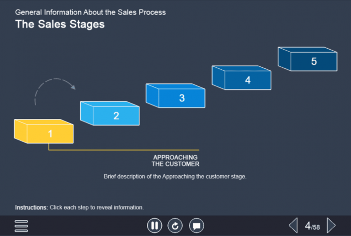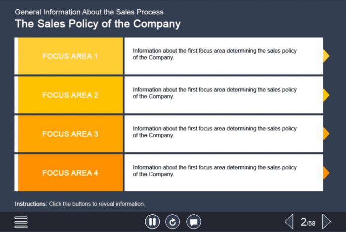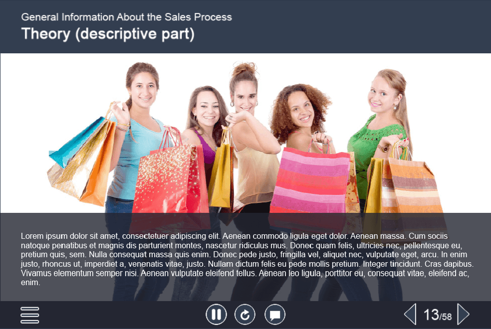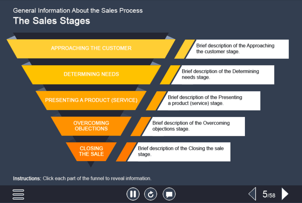 Effective Sales Course Starter Template — Adobe Captivate. The highly-functional elearning asset designed for creating training courses to improve the effectiveness of sales professionals. It can be launched on both PC and tablet. The navigation keys are located in the lower right part of the screen. Due to the large clickable buttons, it will be convenient to use the template on mobile devices with touchscreens larger than 7 inches.