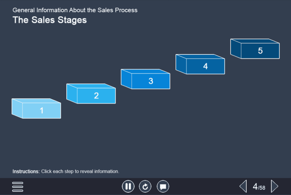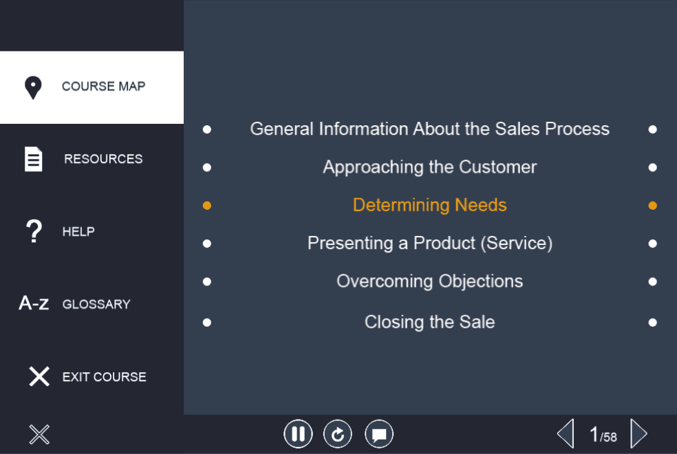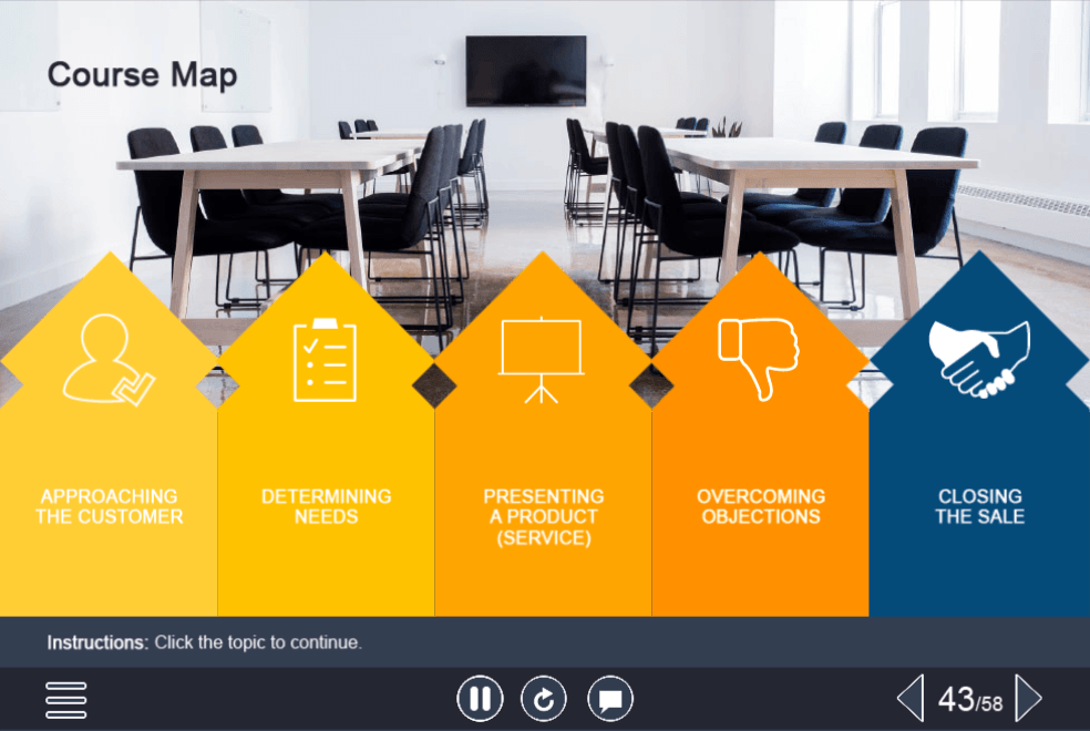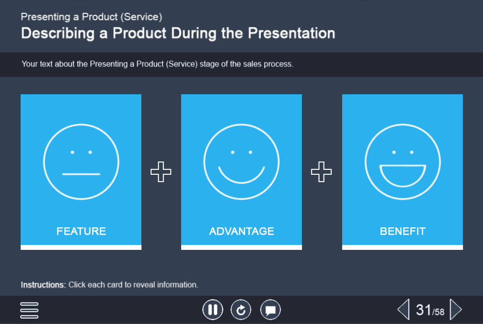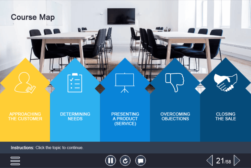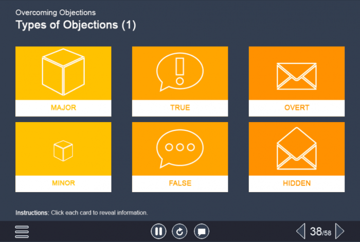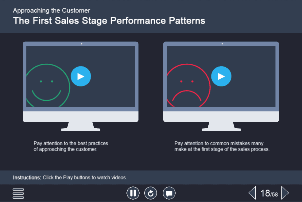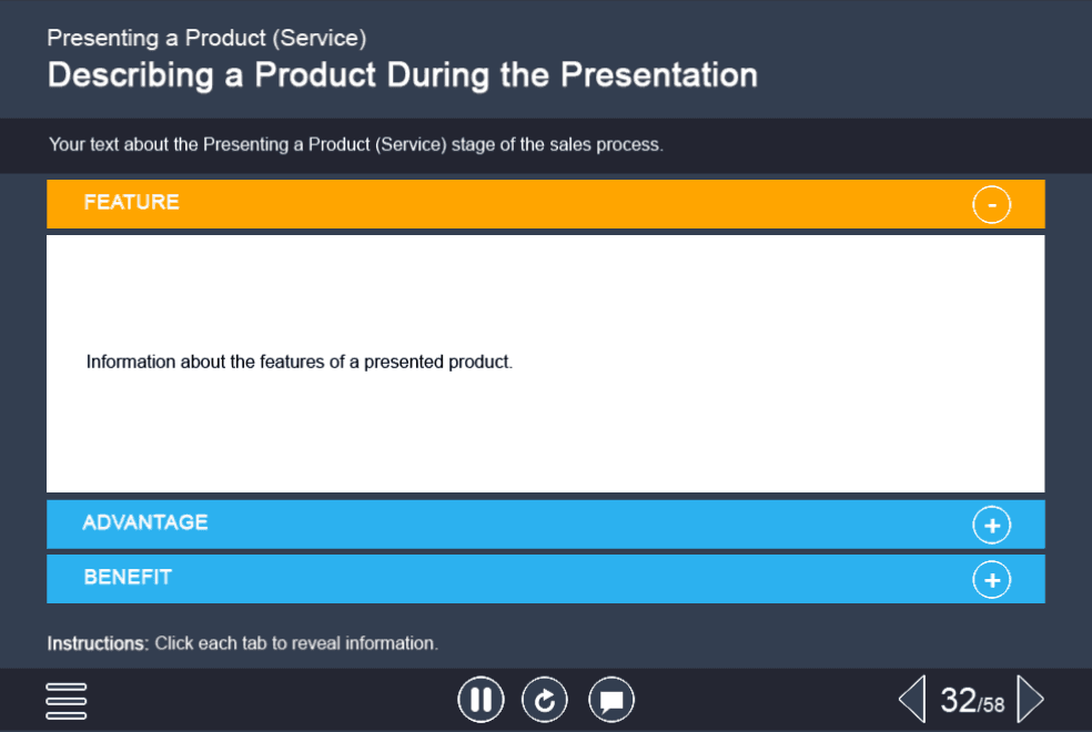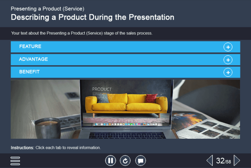 Effective Sales Course Starter Template — Adobe Captivate. The highly-functional elearning asset designed for creating training courses to improve the effectiveness of sales professionals. It can be launched on both PC and tablet. The navigation keys are located in the lower right part of the screen. Due to the large clickable buttons, it will be convenient to use the template on mobile devices with touchscreens larger than 7 inches.