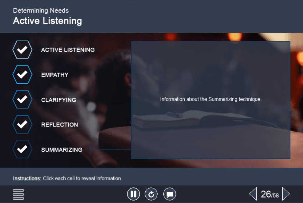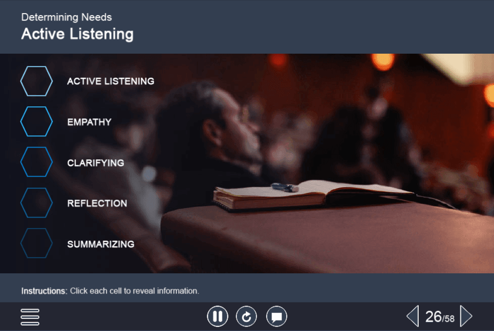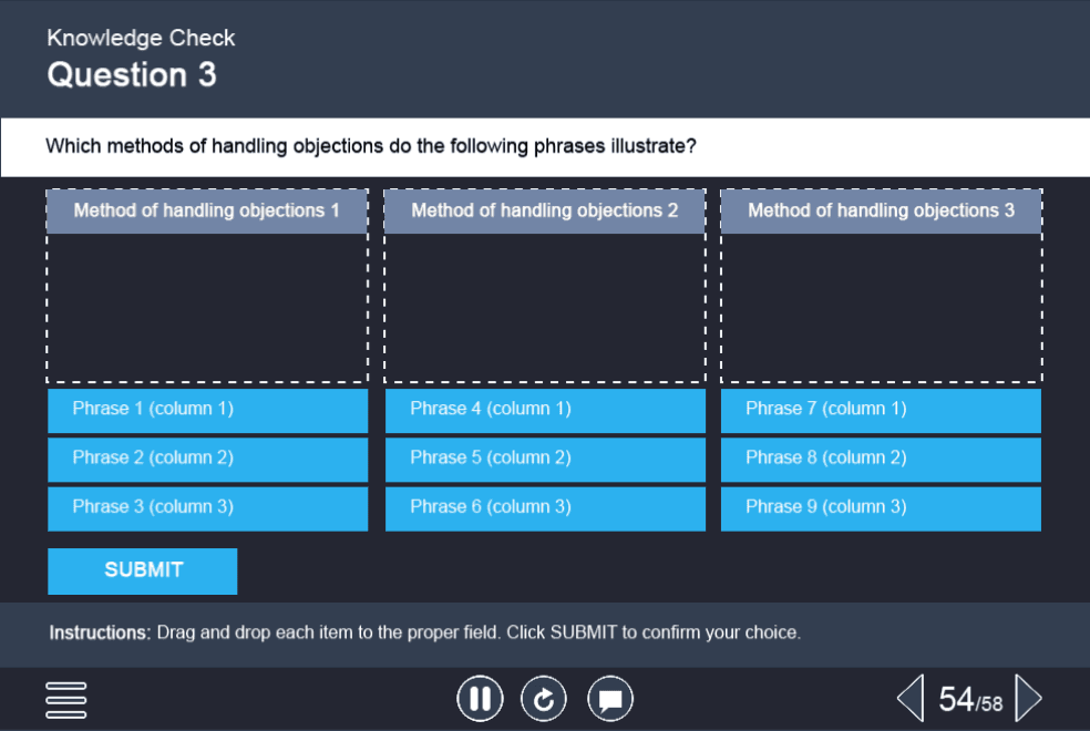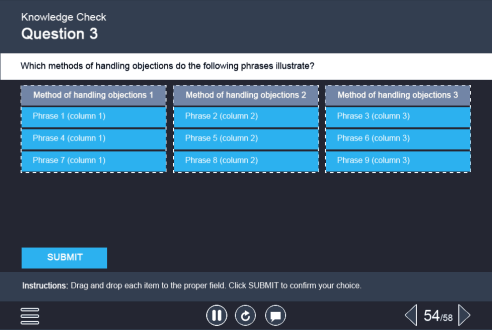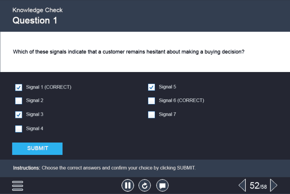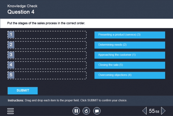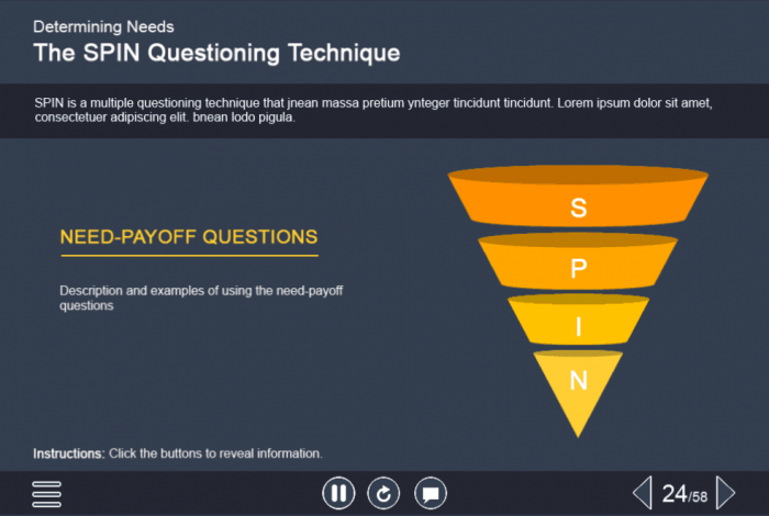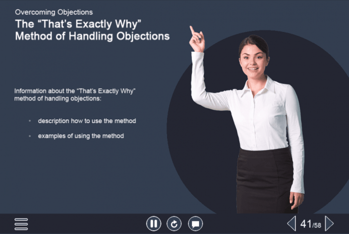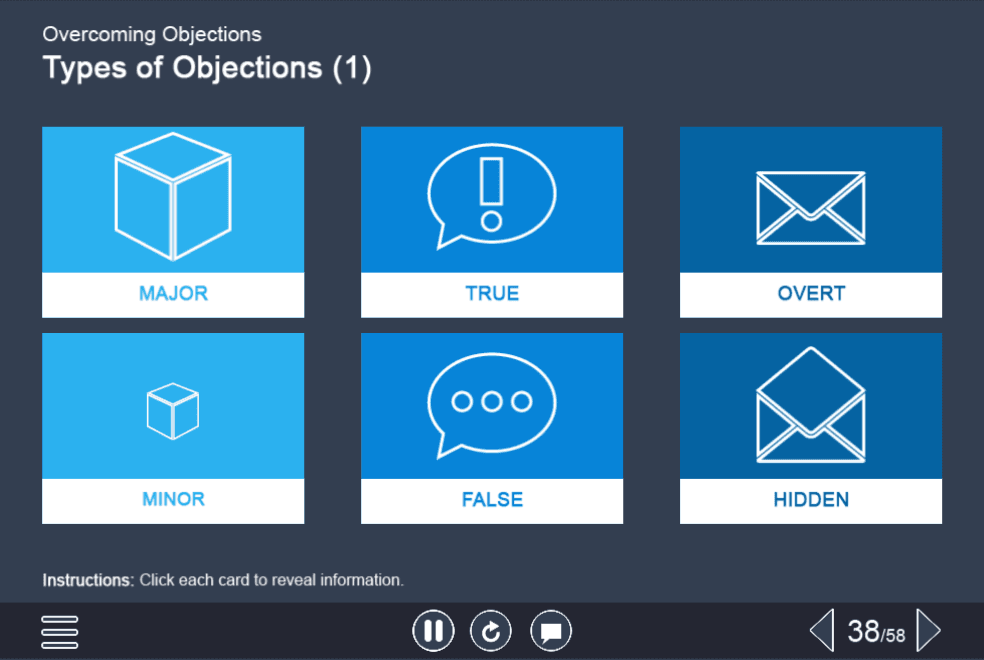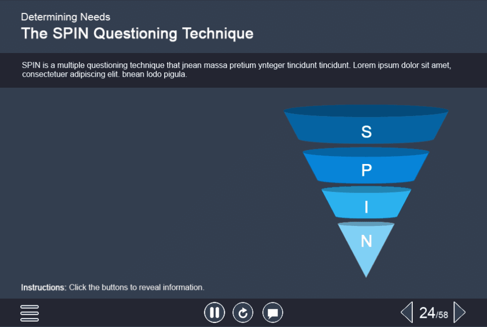 Effective Sales Course Starter Template — Adobe Captivate. The highly-functional elearning asset designed for creating training courses to improve the effectiveness of sales professionals. It can be launched on both PC and tablet. The navigation keys are located in the lower right part of the screen. Due to the large clickable buttons, it will be convenient to use the template on mobile devices with touchscreens larger than 7 inches.