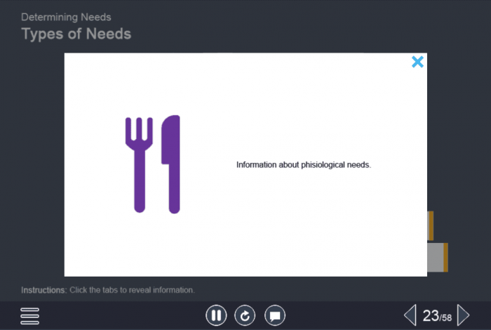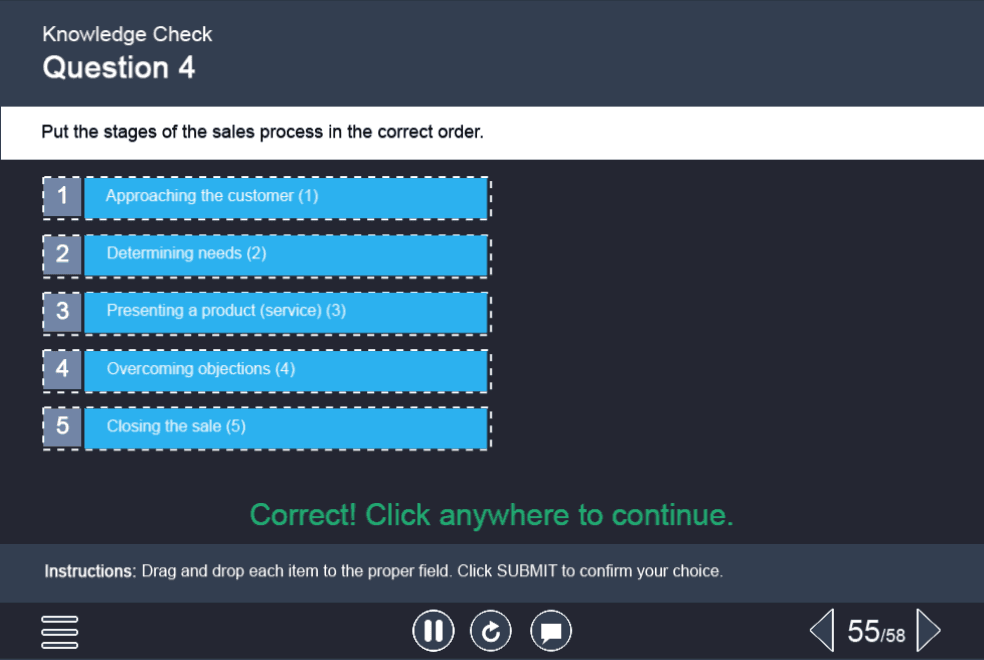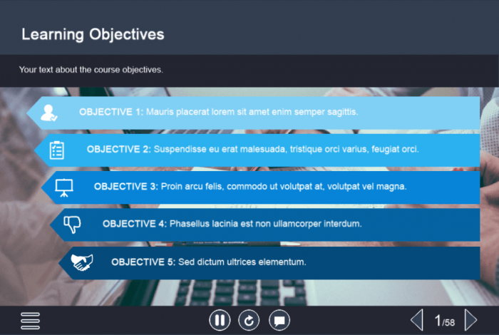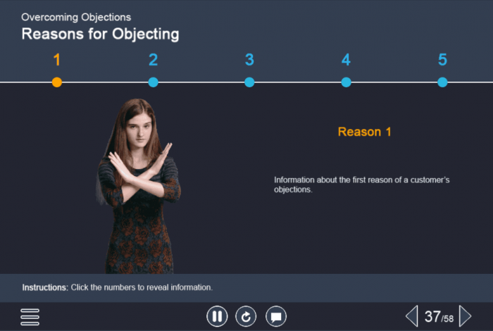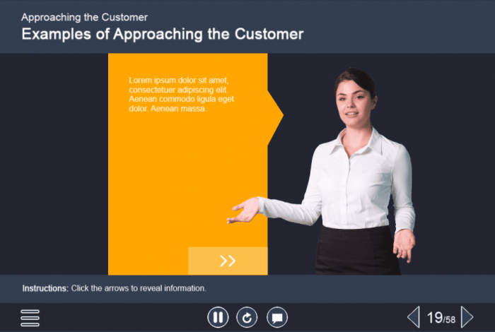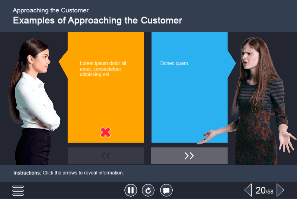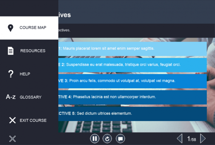 - Features: custom course map, custom navigation, custom voice/animation control, various versions of interactive slides, integrated cutout characters, closed captions, audio player, video player, single and multiple choice quizzes, attached documents, drop-down lists