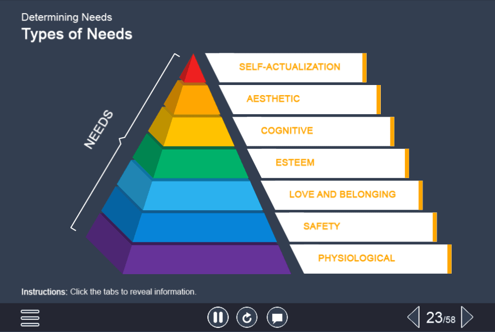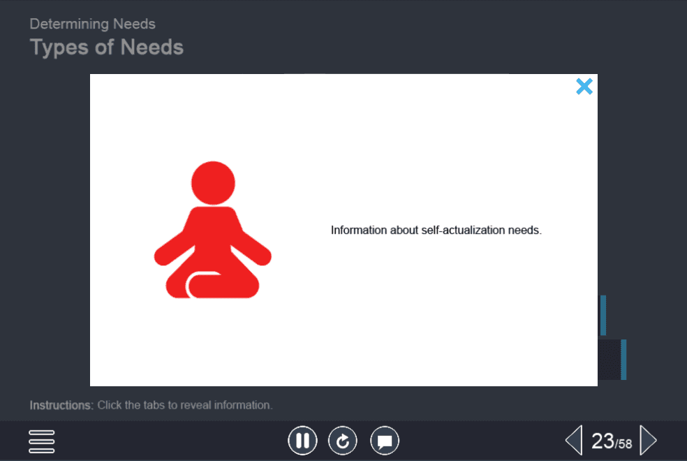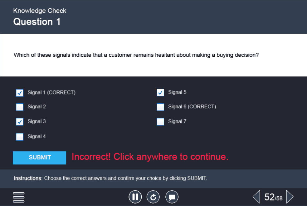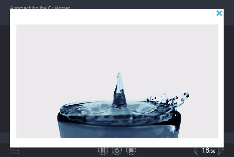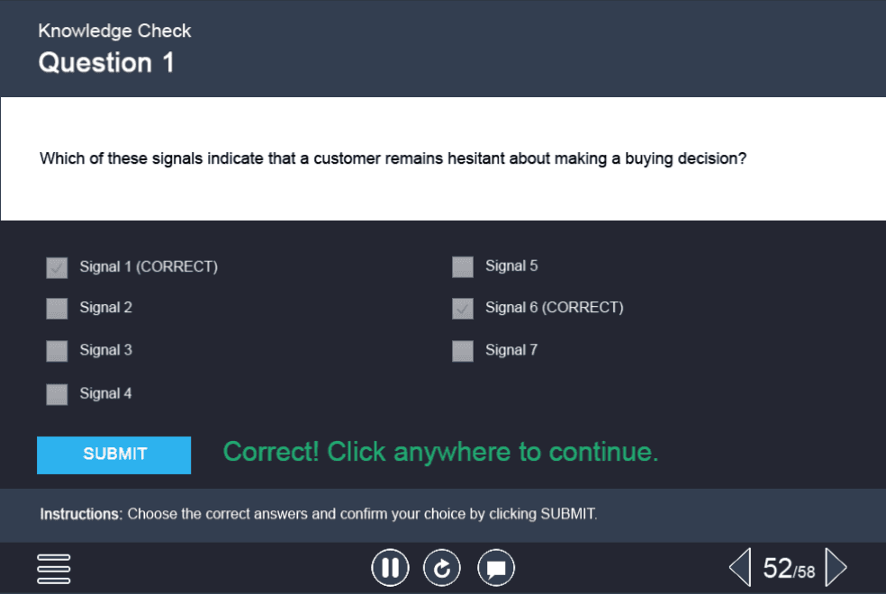 - Features: custom course map, custom navigation, custom voice/animation control, various versions of interactive slides, integrated cutout characters, closed captions, audio player, video player, single and multiple choice quizzes, attached documents, drop-down lists