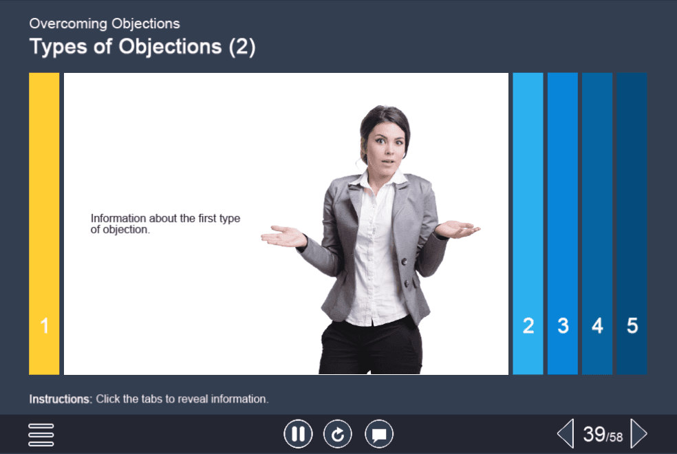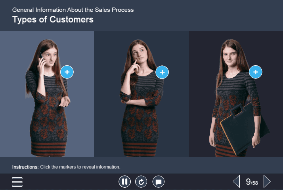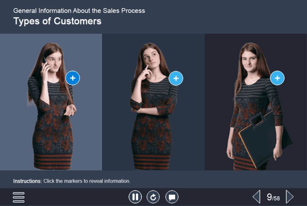 - Types of slides: title, image + text, audio slide, video slide, slides with cutout business characters, slides with text + image, tabs and buttons, steps, drag and drop, slider interaction, markers, pop-ups, dialogue, accordion, timeline, pre-test slide, slide with the course results