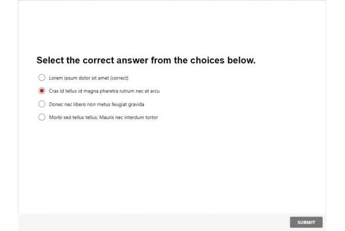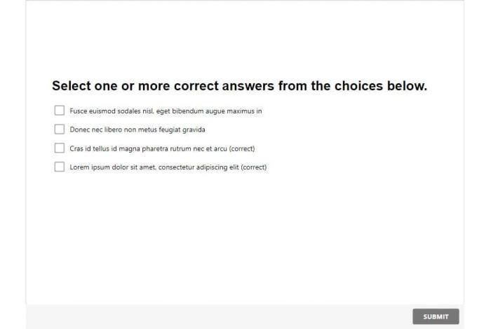 - Features: custom course map, custom navigation, custom voice/animation control, various versions of interactive slides, integrated cutout characters, closed captions, audio player, video player, single and multiple choice quizzes
