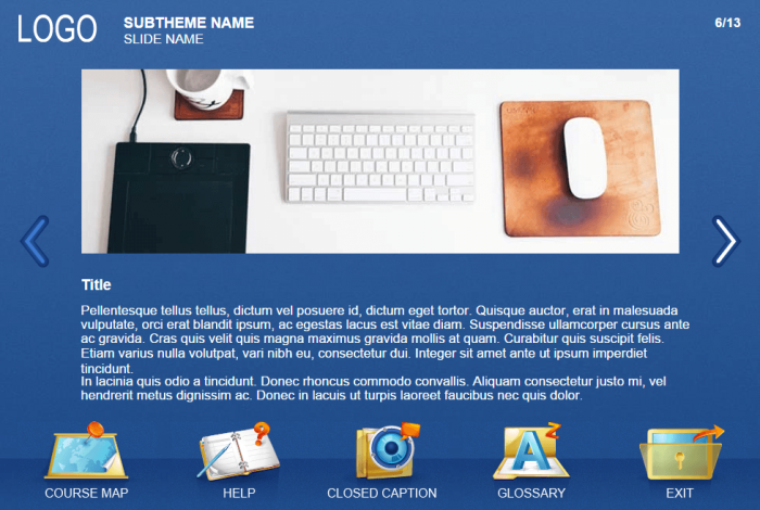 Lectora Course Template With Modern Design is a perfect tool for creating your own e-learning courses, suitable both for tablet and PC. Big navigation keys allow to view content on a small screens or mobile phones. It’s recommended to use on electronic devices with screens larger than 7 inches.