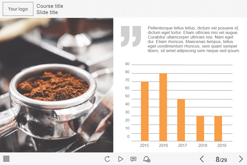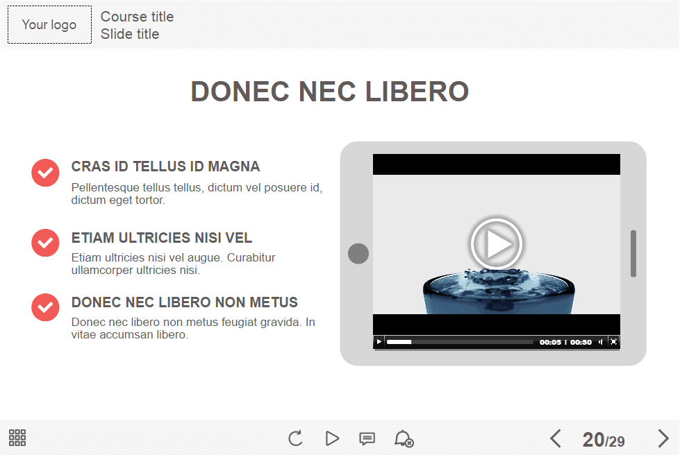 - Features: custom course map, custom navigation, custom voice/animation control, various versions of image slides, flip cards, tabs, infographics, vertical timeline, steps, dialogues, icon style interactions, integrated cutout characters, closed captions, audio player, video player, single choice quizzes