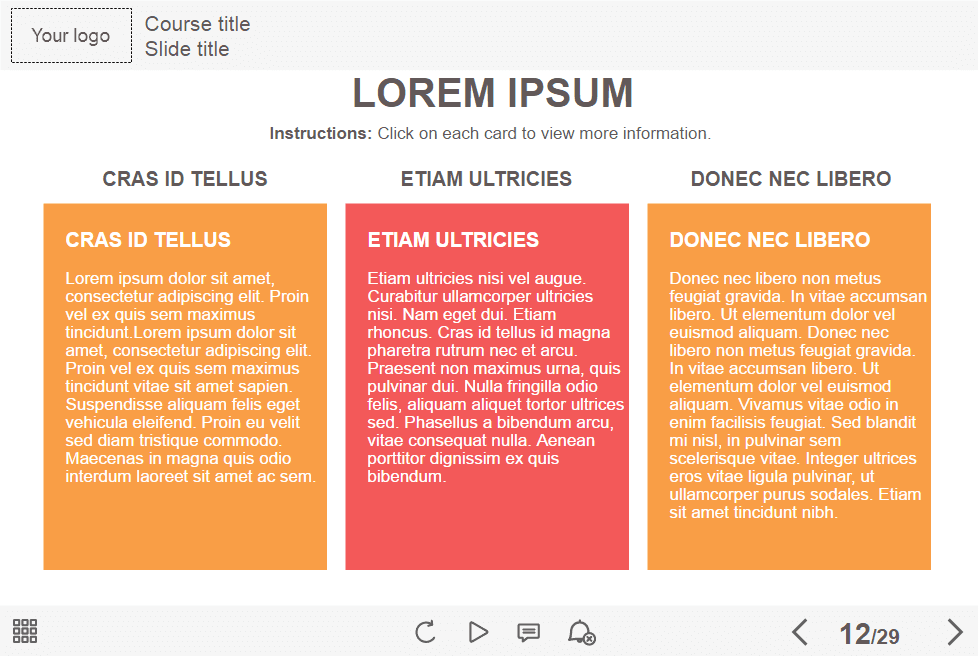 Designed in white, light red and orange colors but white is used as a primary. The distinctive feature of this template is an enhanced functionality, that is realized in various interactions to make your e-course much more effective. This template will definitely grab learners’ attention. Perfectly runs on both Tablet and PC. Navigation keys are located in the lower right part. It’s recommended to use on electronic devices with screens larger than 7 inches.