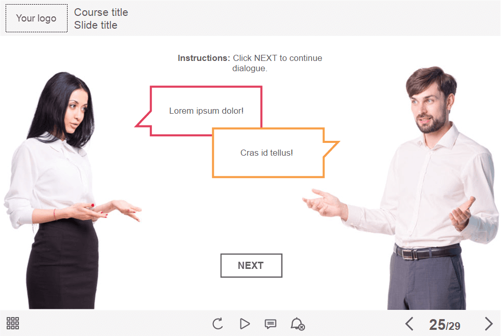 Lectora Template is composed of 29 sample slides in order to help you develop your own elearning course. It contains dialogue slides between different characters, various versions of image slides, infographics, flip cards, timeline, steps, dialogues, tabs and buttons slides to reveal additional info. Template is already designed and prepared for usage.