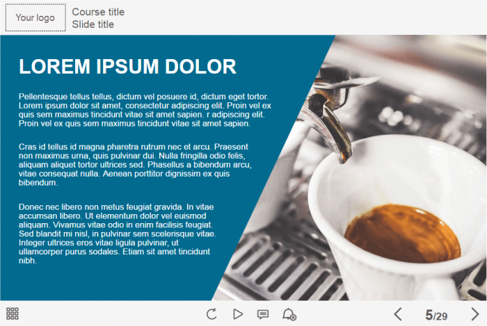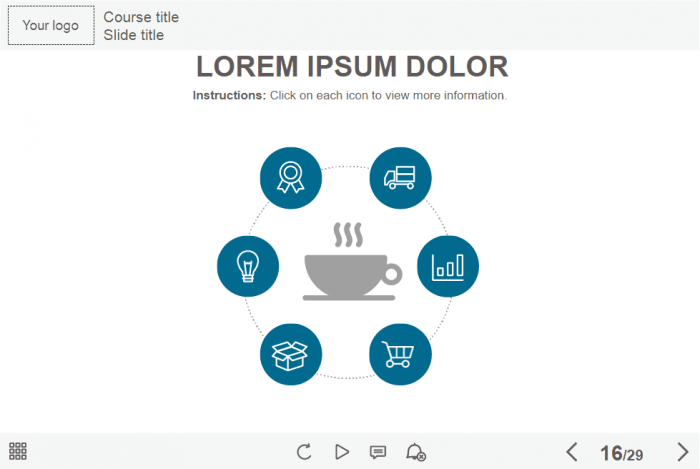 - Features: custom course map, custom navigation, custom voice/animation control, various versions of image slides, flip cards, tabs, infographics, vertical timeline, steps, dialogues, icon style interactions, integrated cutout characters, closed captions, audio player, video player, single choice quizzes