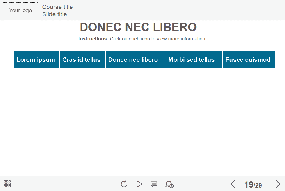 Lectora Course Template is a highly functional tool for creating e-courses. This is a unique elearning template as it includes a full range of storyline interactions, such as steps, timeline, tabs, etc.