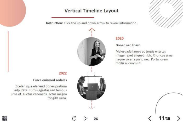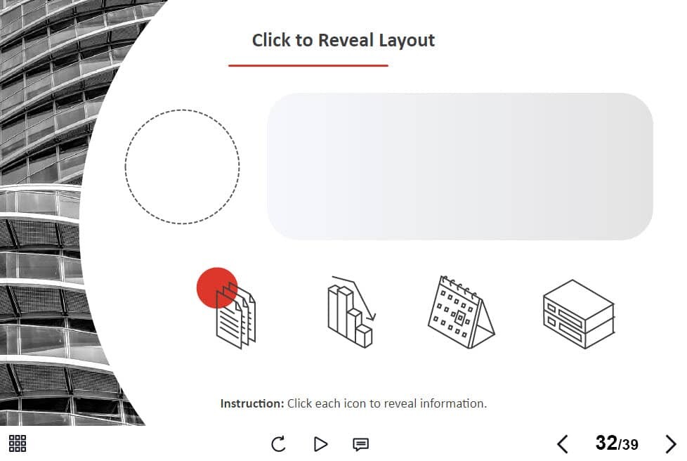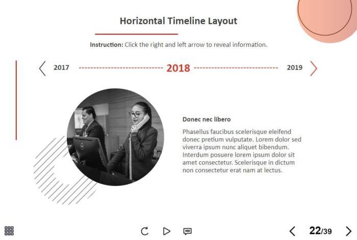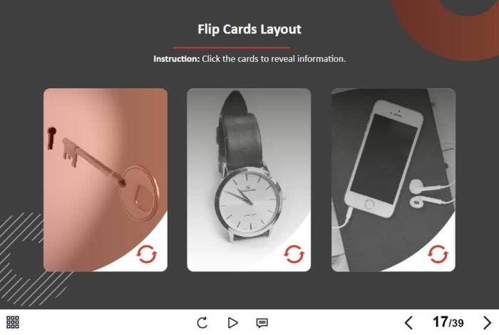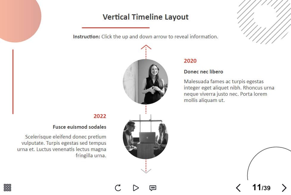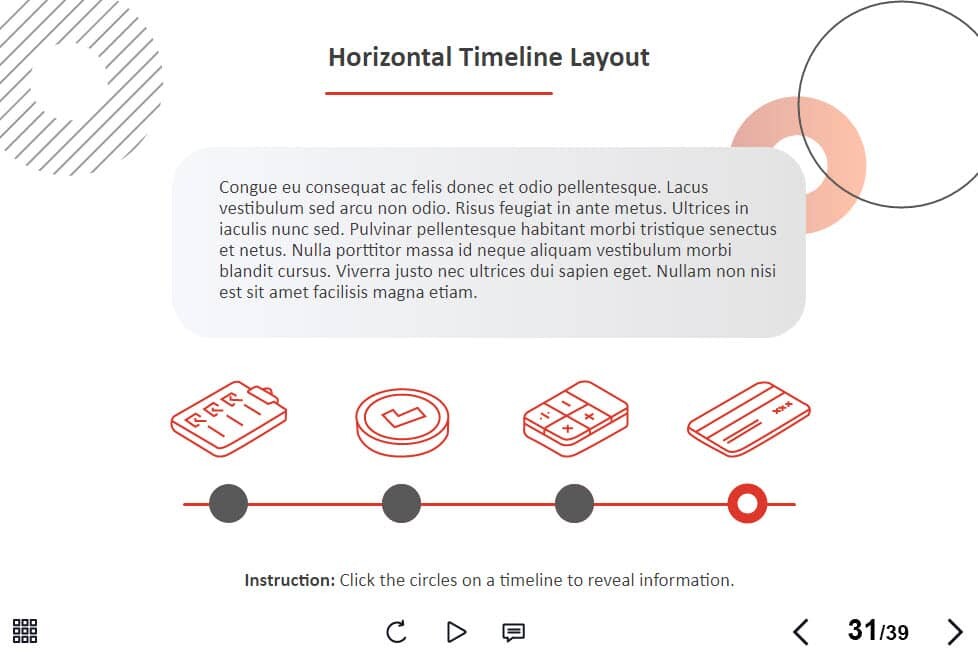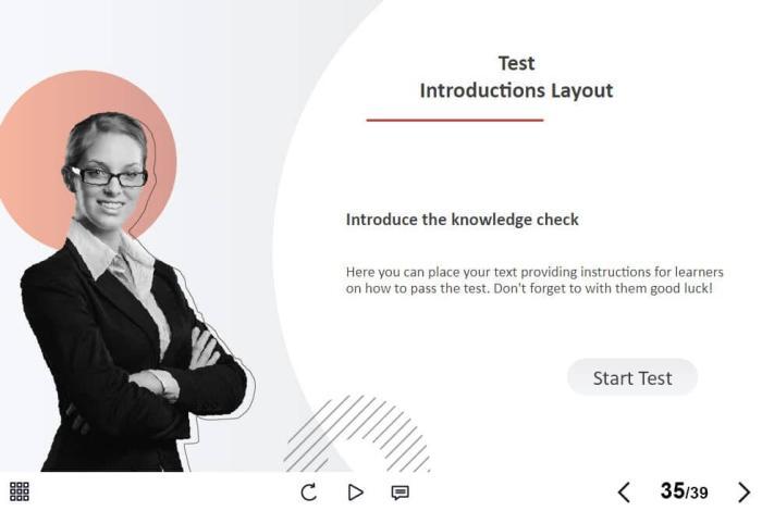 - Types of slides: title, quote, video slide, slides with cutout people photos, slides with text + images, flip cards, pop-ups, tabs, infographics, timelines, steps, grids, accordions, slideshows, pre-test slide, slide with the course results
