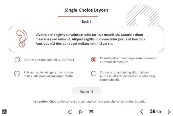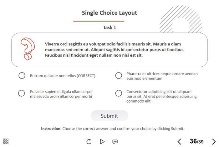 The course starter template is composed of 39 layouts and interactions in order to help you develop your own training course and to improve the learner’s knowledge. It contains various versions of interactive slides such as steps, pop-ups, tabs, and many others that are created to reveal the course information. The knowledge check module includes two tasks such as questions with single and multiple answer options. It transfers results to LMS according to SCORM, AICC, Tin Can API standards.